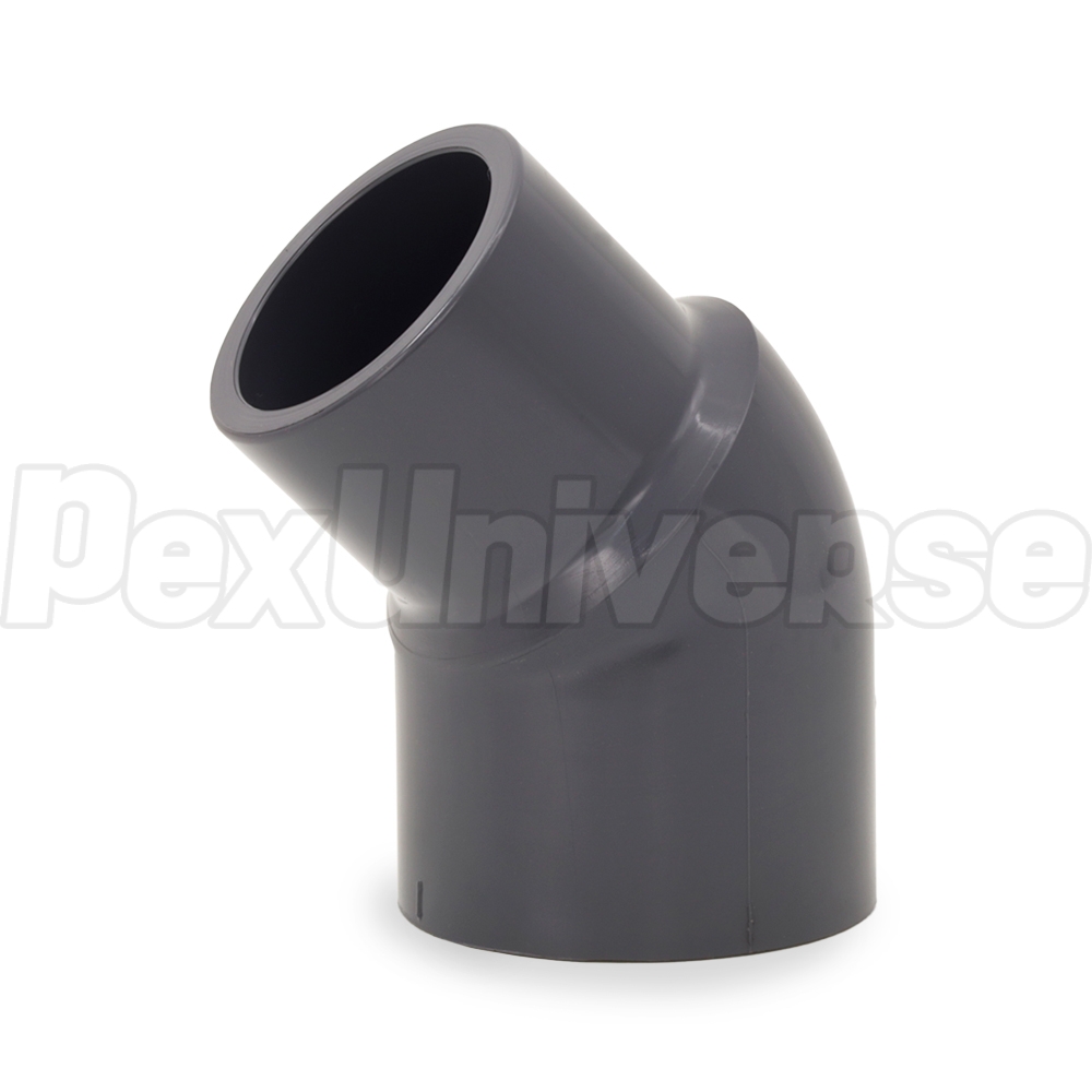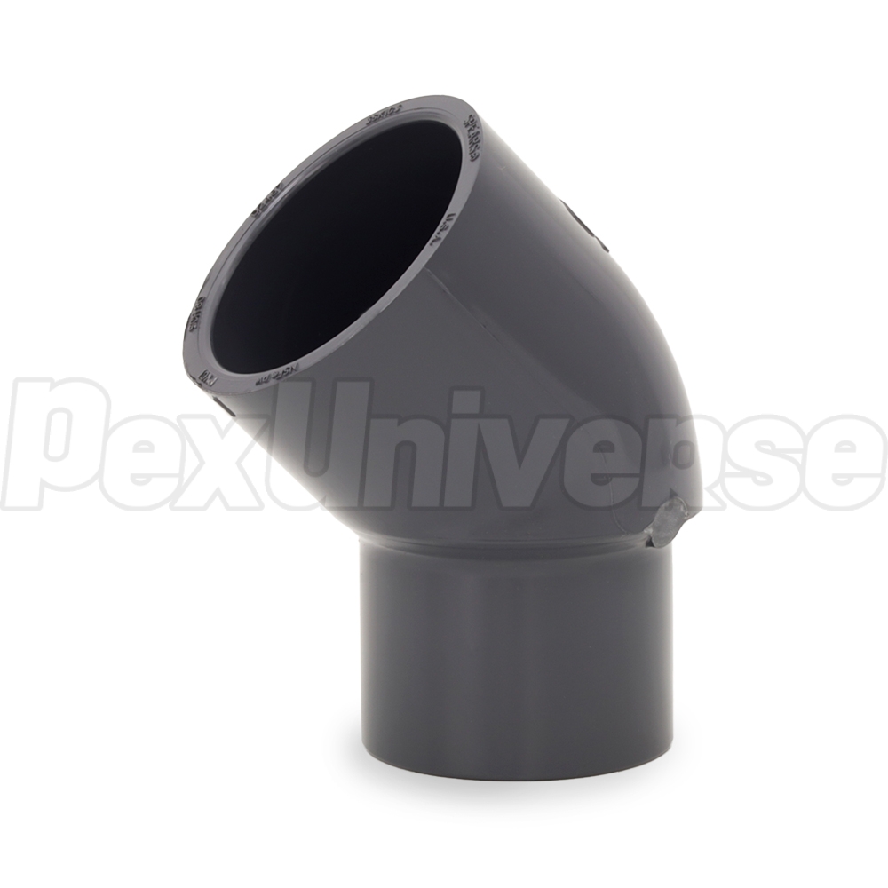 This elbow fitting connects 2" Sch 80 PVC pipe to a 2" Sch 80 PVC fitting, valve or outlet at a 45-degree angle. Socket (hub) x Spigot (equivalent to PVC pipe) connections.