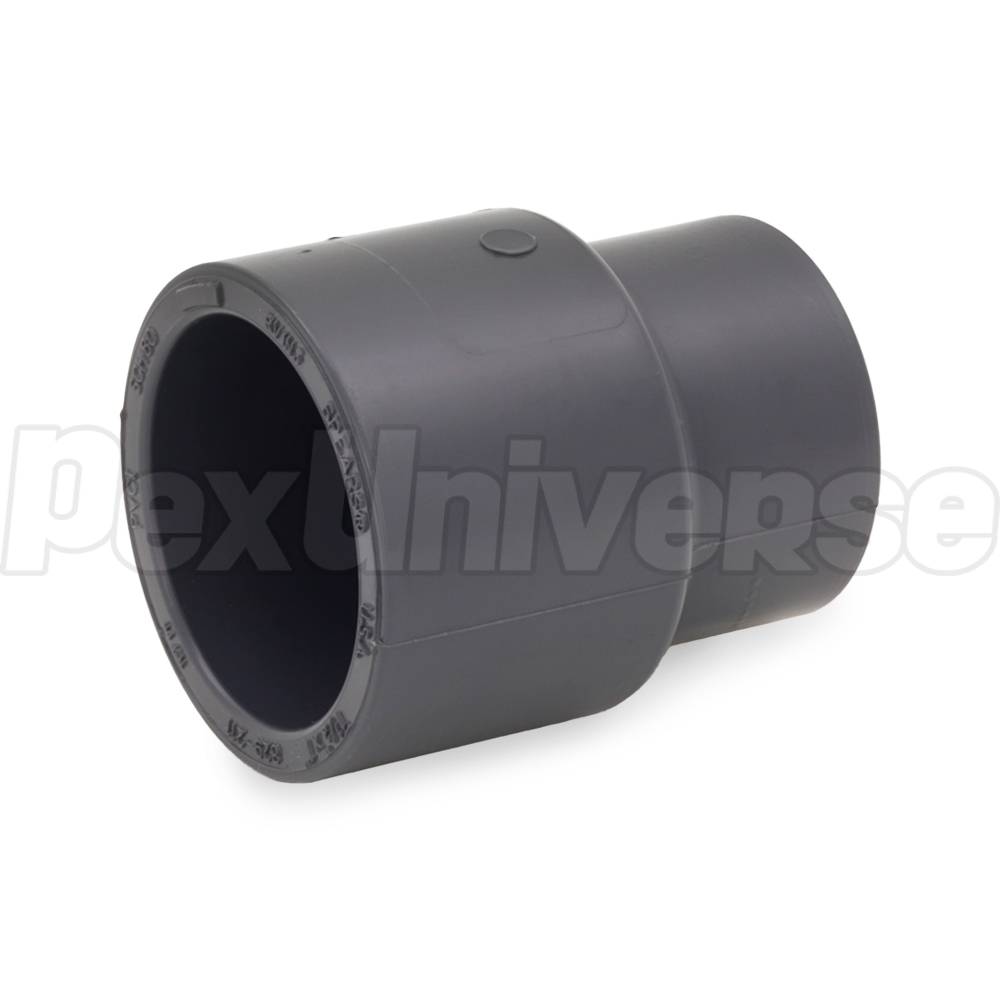 This Schedule 80 PVC reducing coupling fitting connects 1-1/2" PVC pipe to 1" PVC pipe in a straight line. Socket (hub) connections on both outlets.