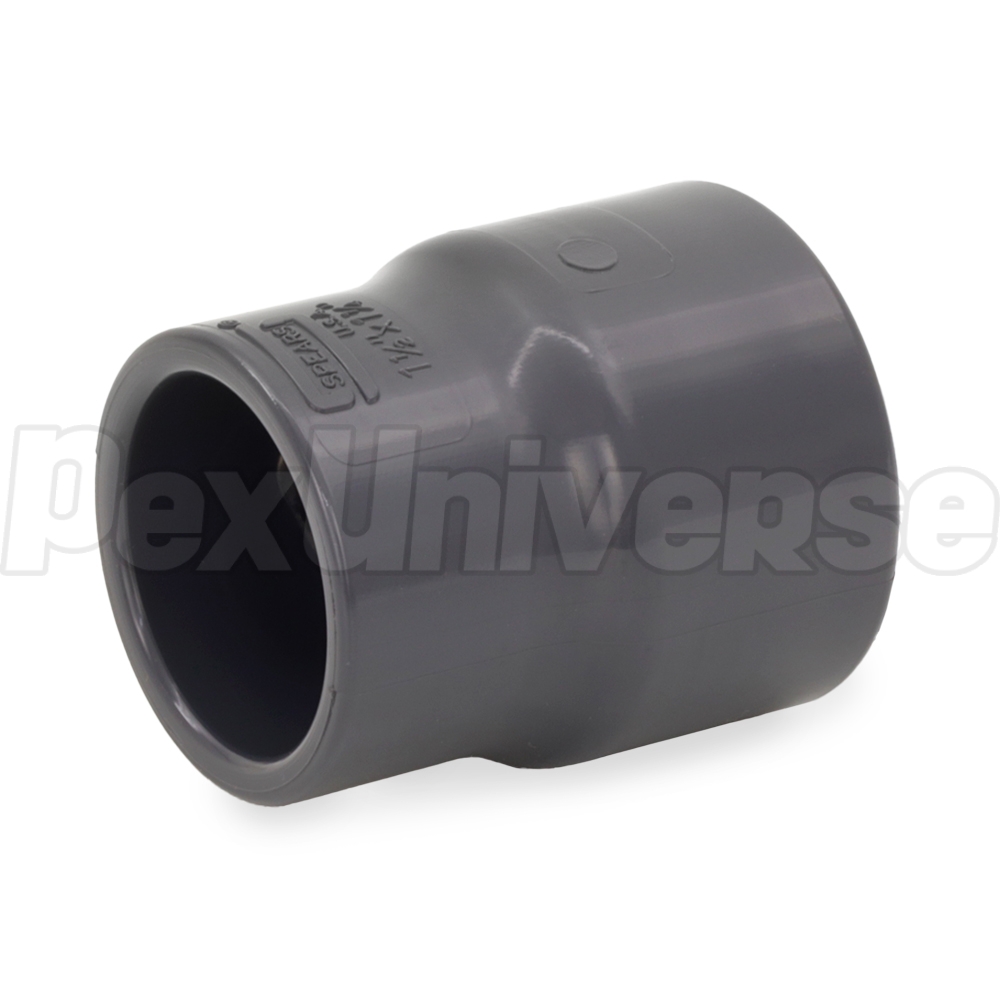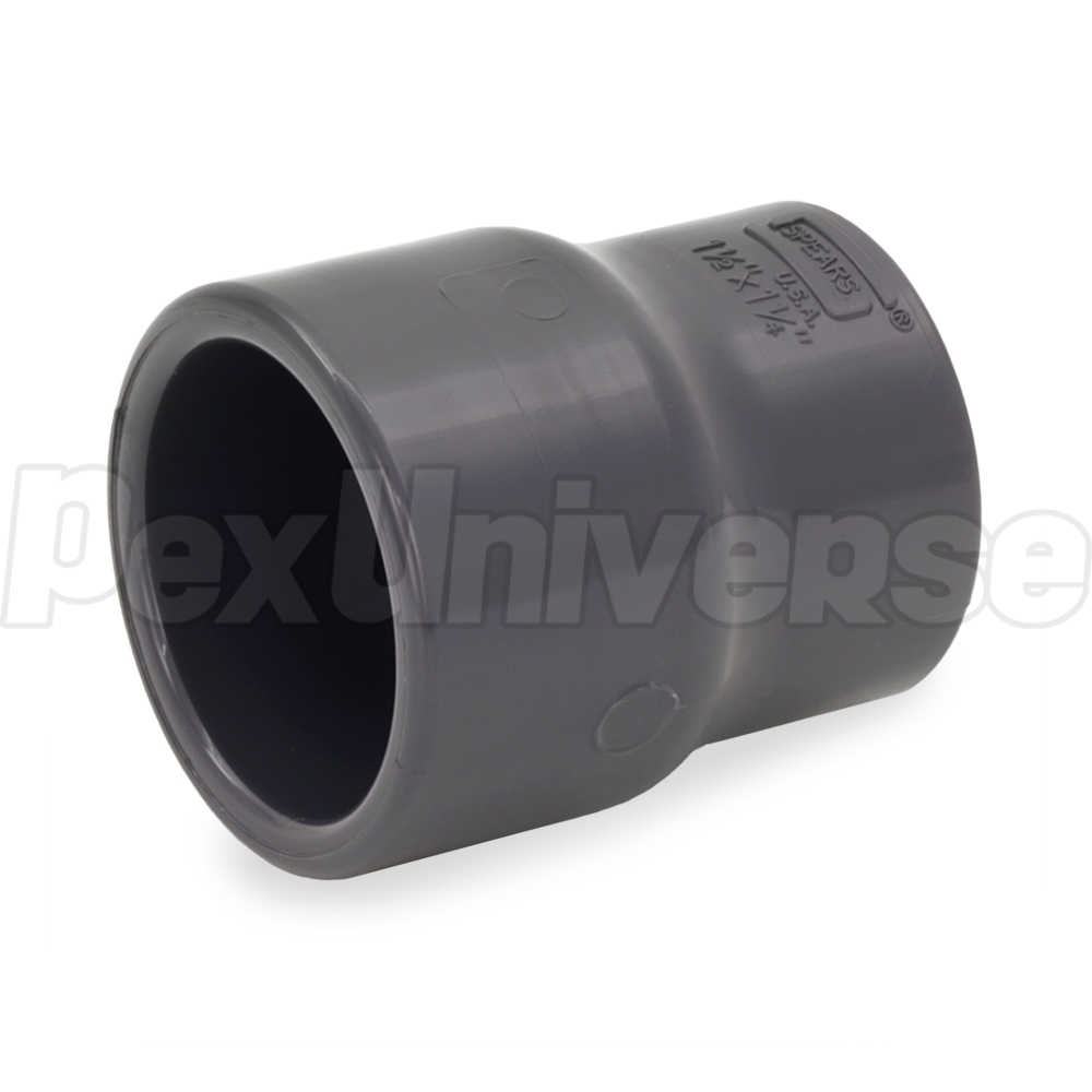 This Schedule 80 PVC reducing coupling fitting connects 1-1/2" PVC pipe to 1-1/4" PVC pipe in a straight line. Socket (hub) connections on both outlets.