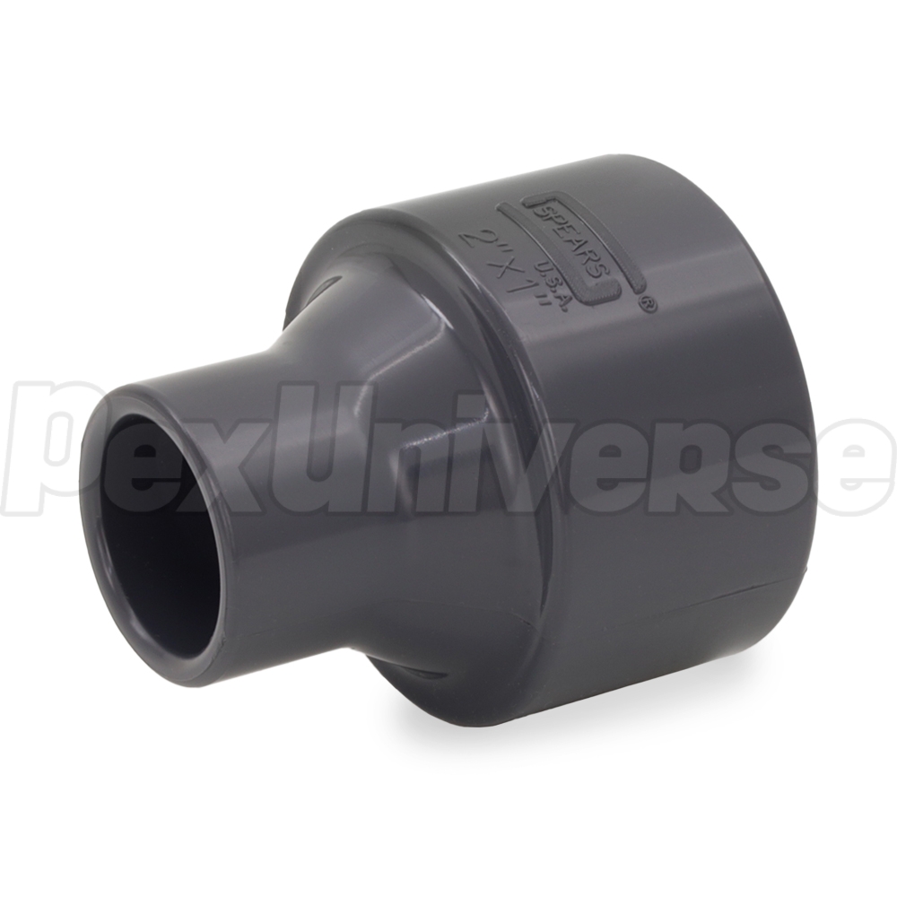 This Schedule 80 PVC reducing coupling fitting connects 2" PVC pipe to 1" PVC pipe in a straight line. Socket (hub) connections on both outlets.