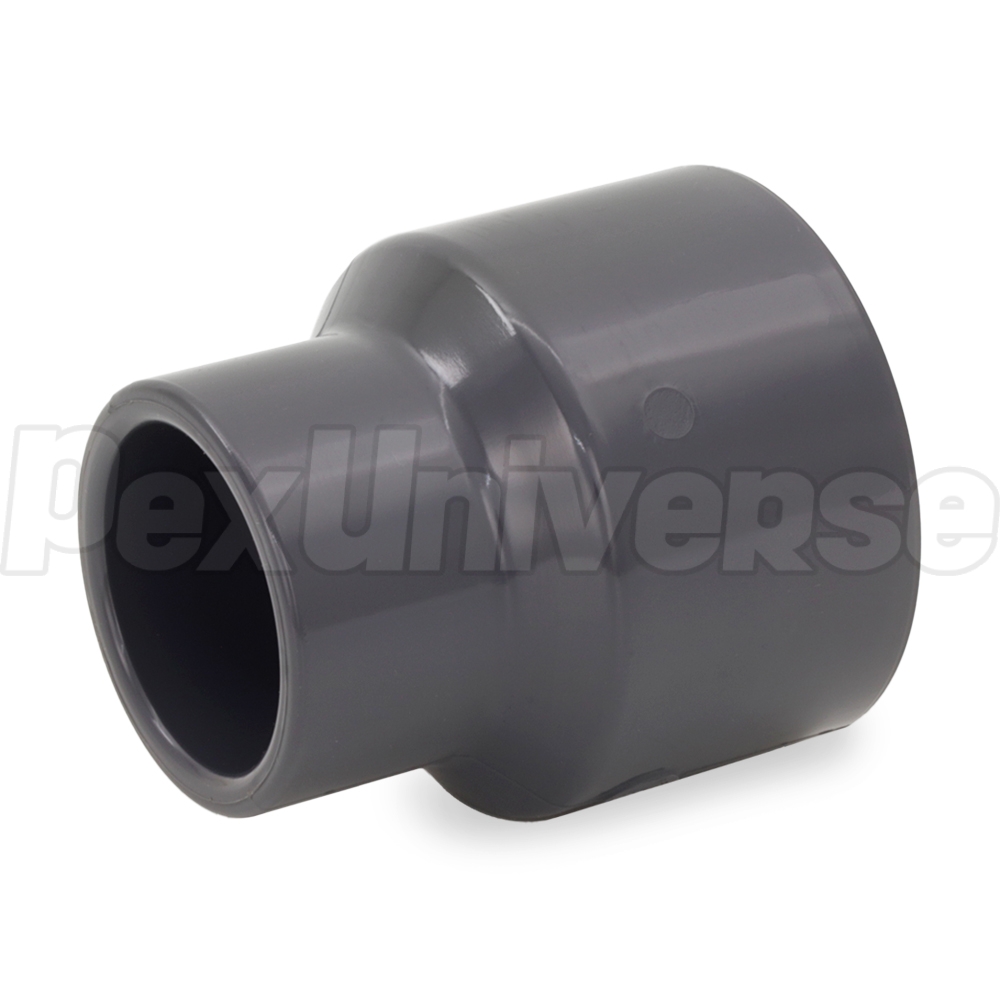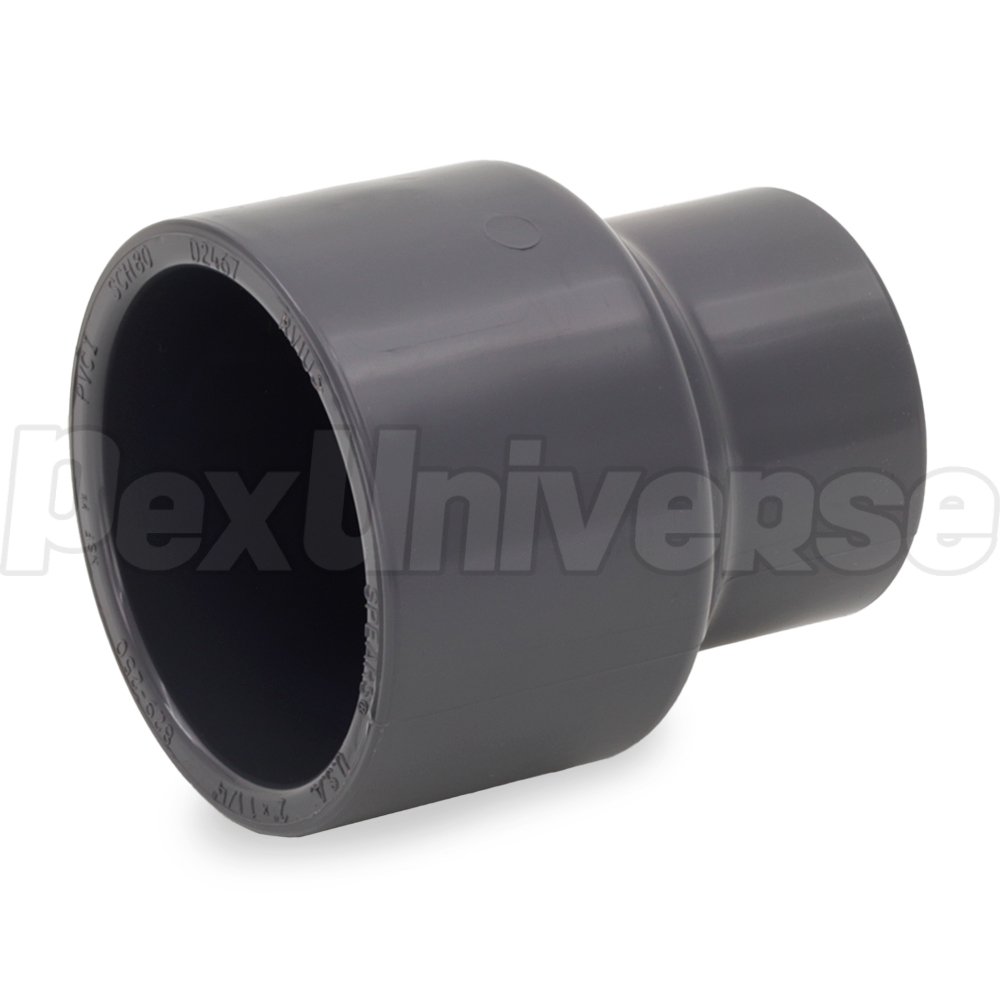 This Schedule 80 PVC reducing coupling fitting connects 2" PVC pipe to 1-1/4" PVC pipe in a straight line. Socket (hub) connections on both outlets.