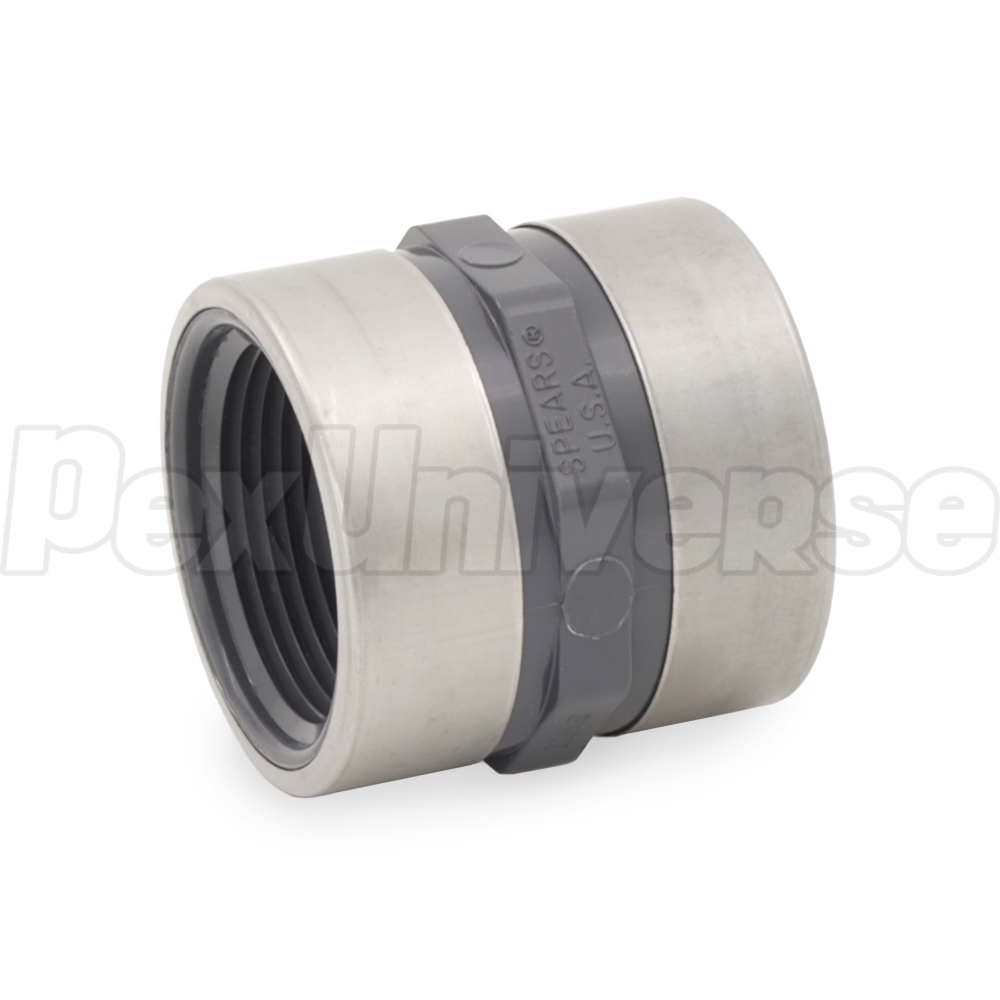 This Sch 80 PVC equal threaded coupling fitting connects (2) 1-1/4" male NPT threaded pipes, pipe nipples, fittings or valves together in a straight line. This fitting is SR (Special Reinforced) type, with stainless steel bands to prevent fitting cracking from over-tightening or vibrations.