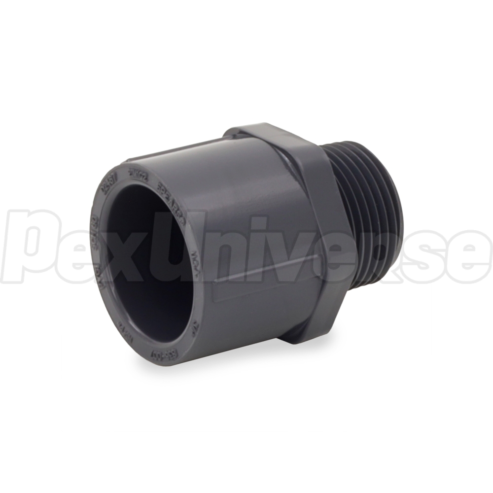 This Schedule 80 male threaded adapter fitting connects 3/4" Sch 80 PVC pipe to a 3/4" female threaded fitting, valve or outlet in a straight line. Socket (hub) x MIP (male NPT threaded) connections.