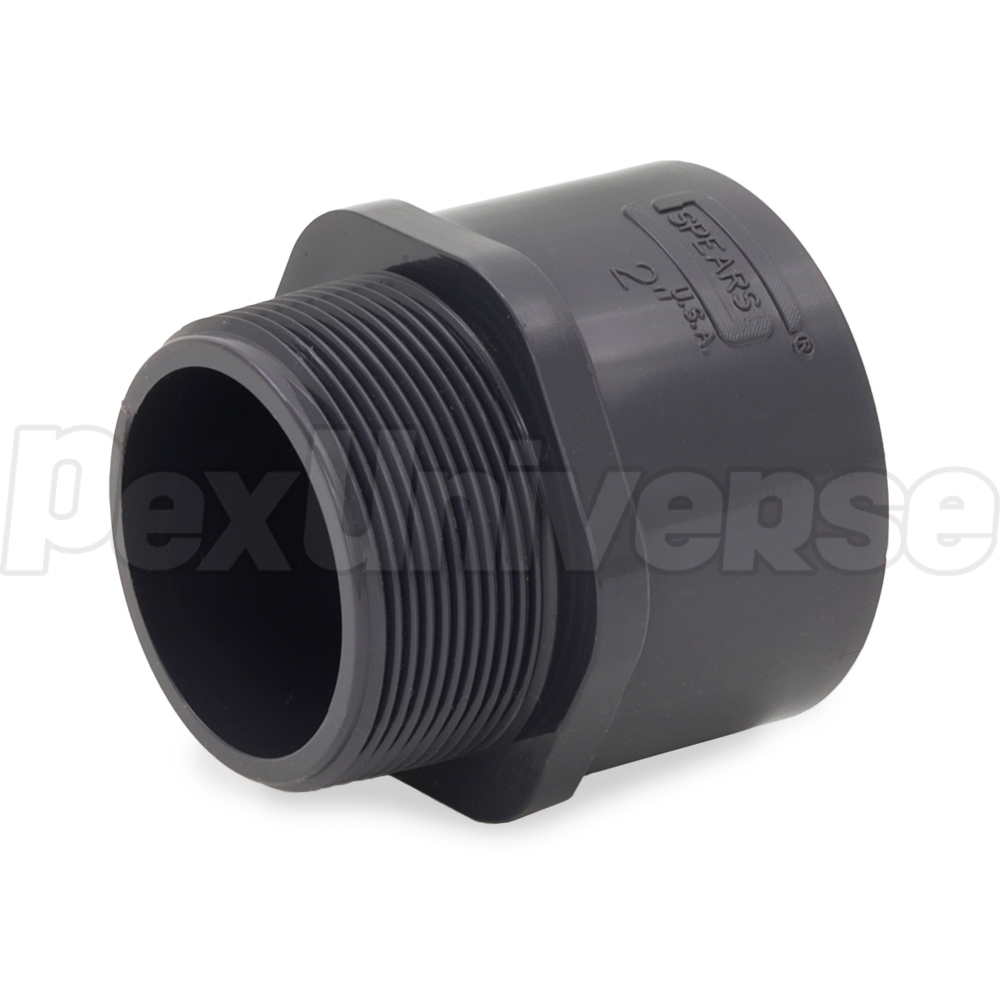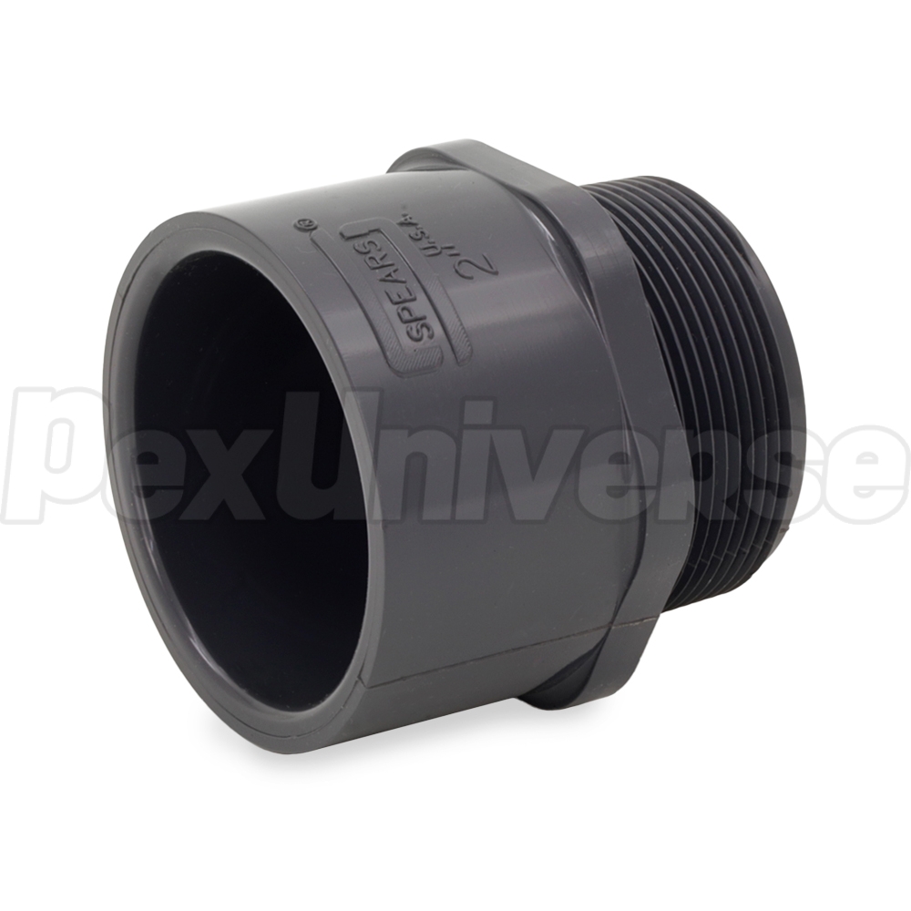 This Schedule 80 male threaded adapter fitting connects 2" Sch 80 PVC pipe to a 2" female threaded fitting, valve or outlet in a straight line. Socket (hub) x MIP (male NPT threaded) connections.