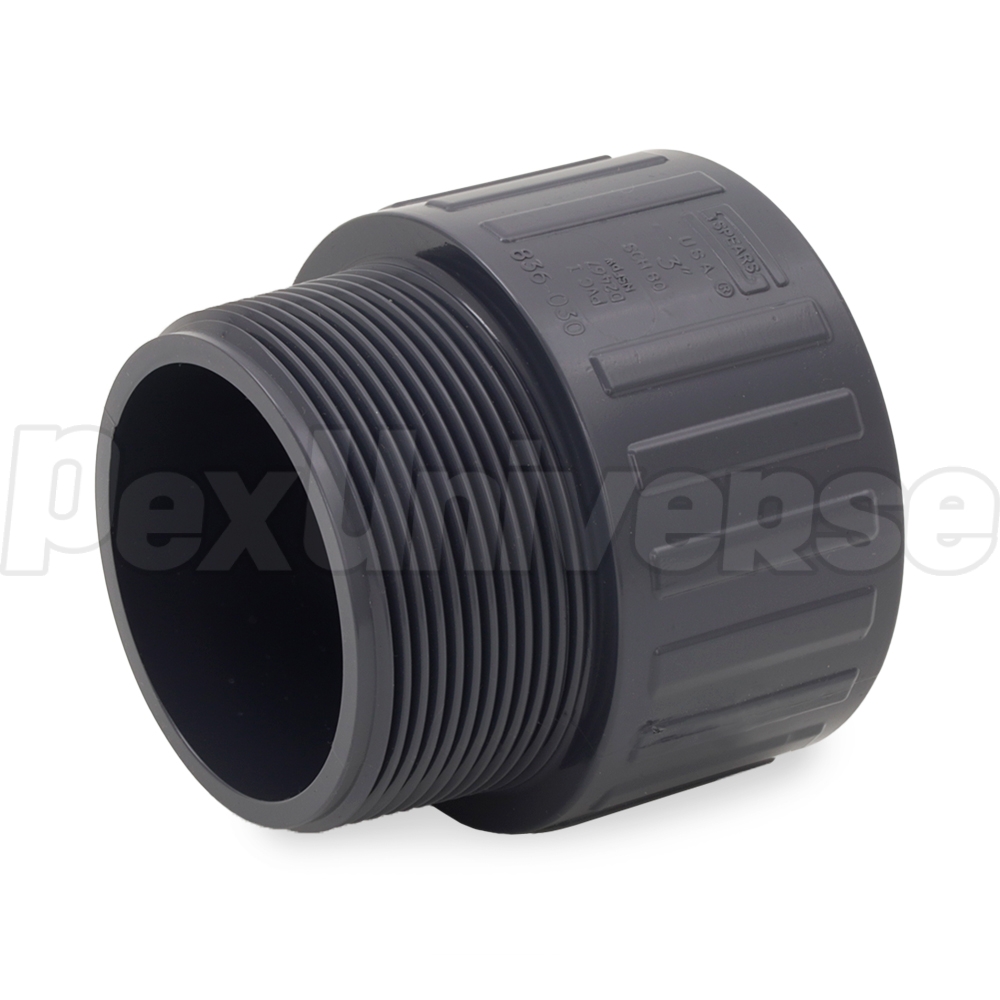 This Schedule 80 male threaded adapter fitting connects 3" Sch 80 PVC pipe to a 3" female threaded fitting, valve or outlet in a straight line. Socket (hub) x MIP (male NPT threaded) connections.