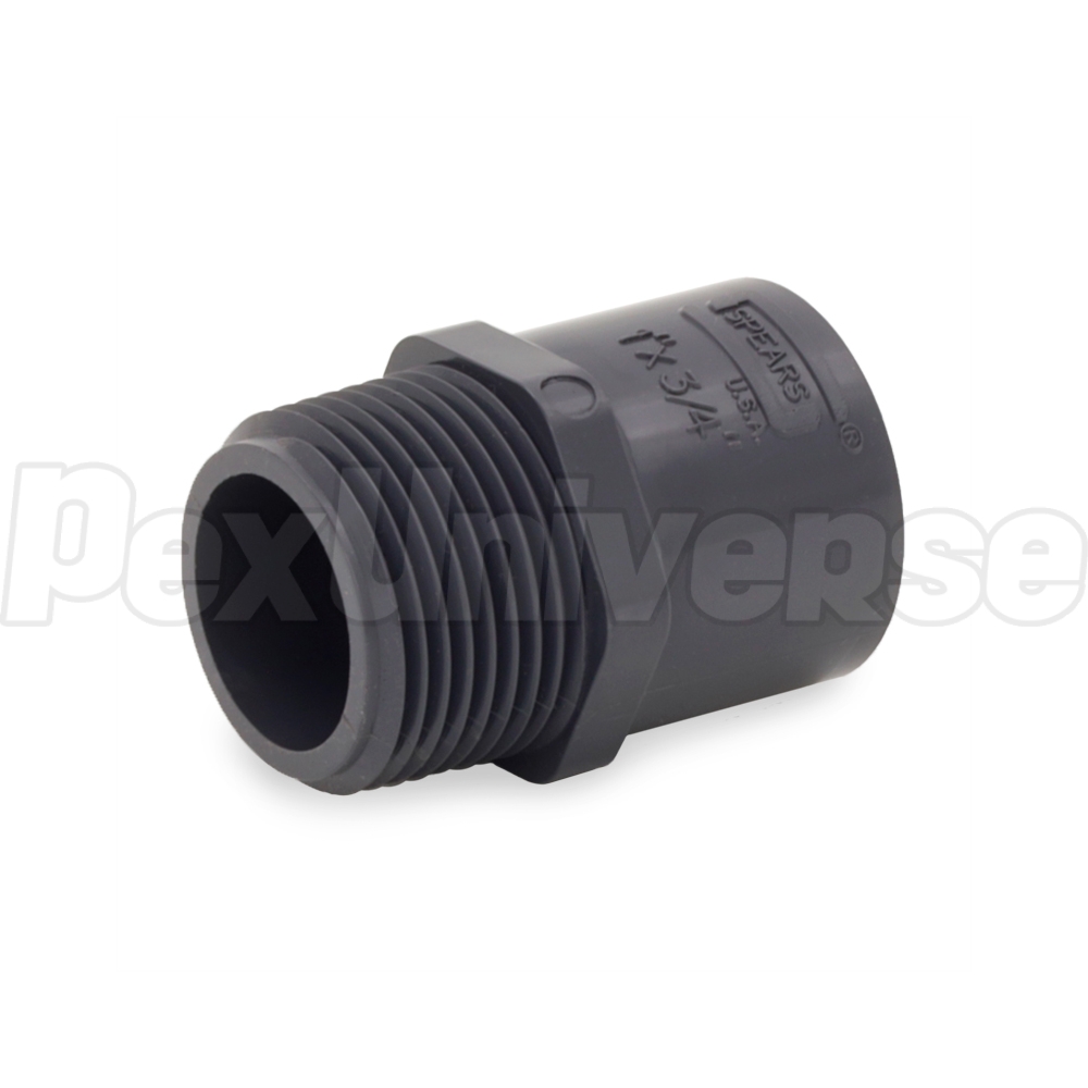This Schedule 80 male threaded adapter fitting connects 3/4" Sch 80 PVC pipe to a 1" female threaded fitting, valve or outlet in a straight line. Socket (hub) x MIP (male NPT threaded) connections.