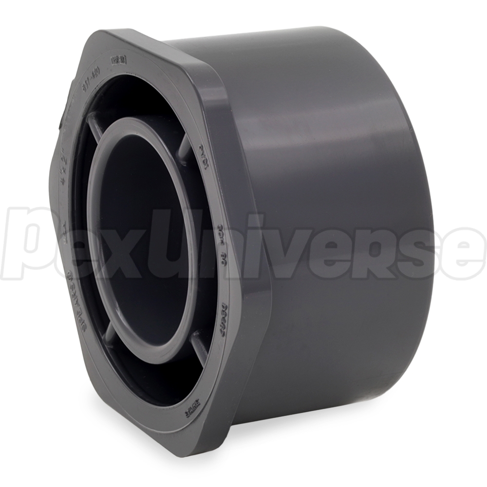 This Schedule 80 PVC reducer bushing adapts 2" PVC pipe inside a 4" PVC fitting or outlet. Spigot x Socket connections.