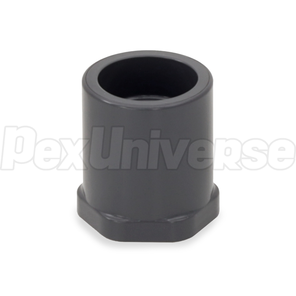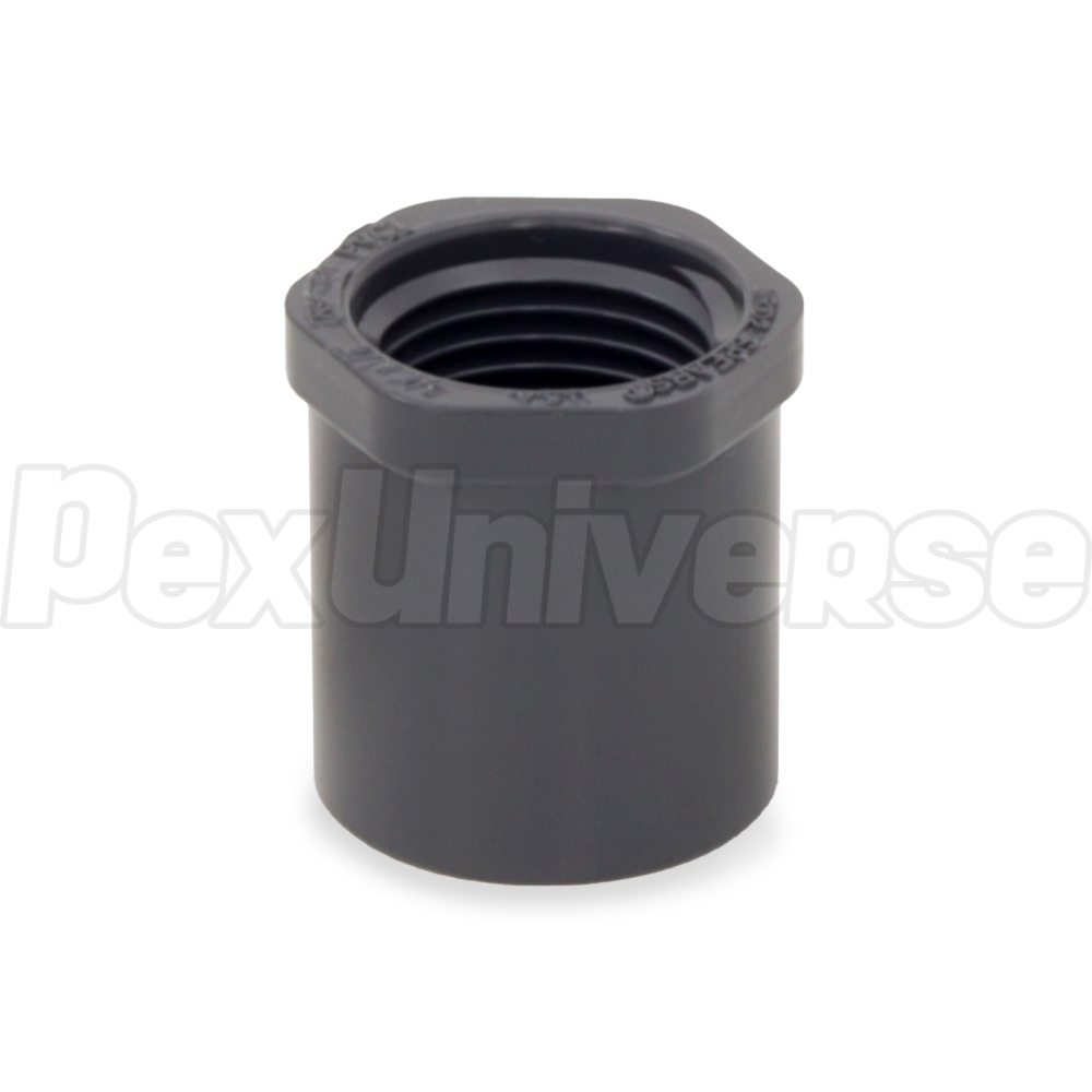 This Schedule 80 PVC reducer bushing adapts 1/2" male threaded pipe/fitting/valve inside a 3/4" PVC fitting or outlet. Spigot x FIP (female NPT threaded) connections.