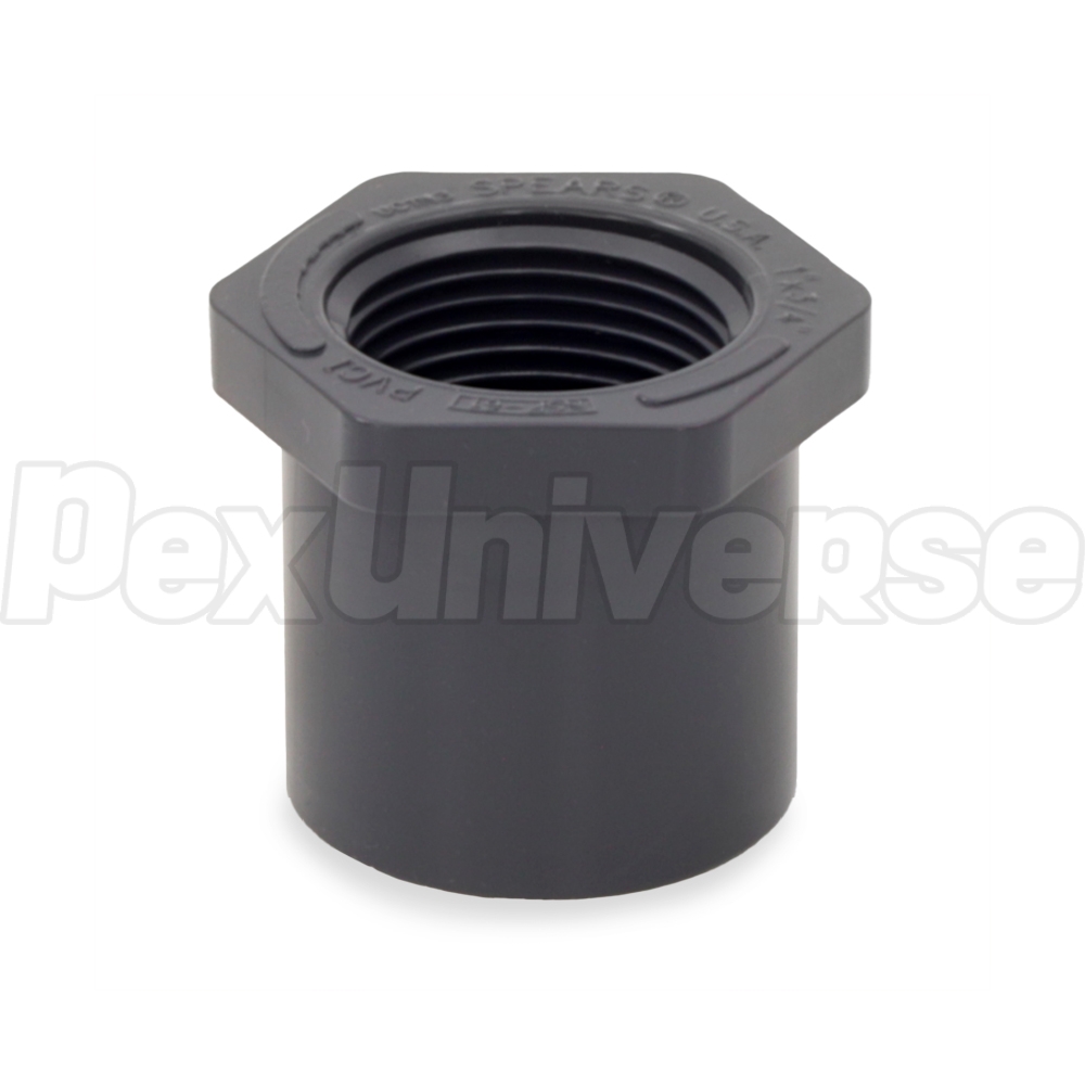 This Schedule 80 PVC reducer bushing adapts 3/4" male threaded pipe/fitting/valve inside a 1" PVC fitting or outlet. Spigot x FIP (female NPT threaded) connections.