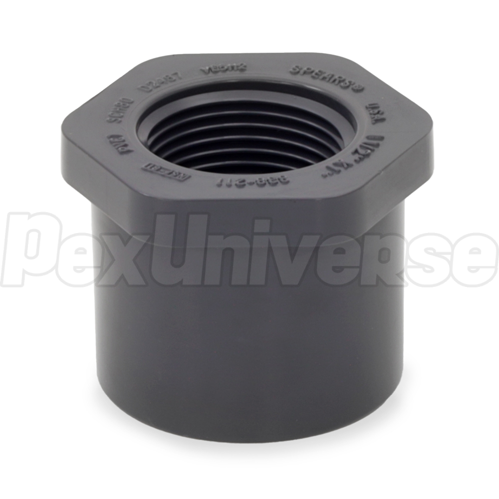 This Schedule 80 PVC reducer bushing adapts 1" male threaded pipe/fitting/valve inside a 1-1/2" PVC fitting or outlet. Spigot x FIP (female NPT threaded) connections.