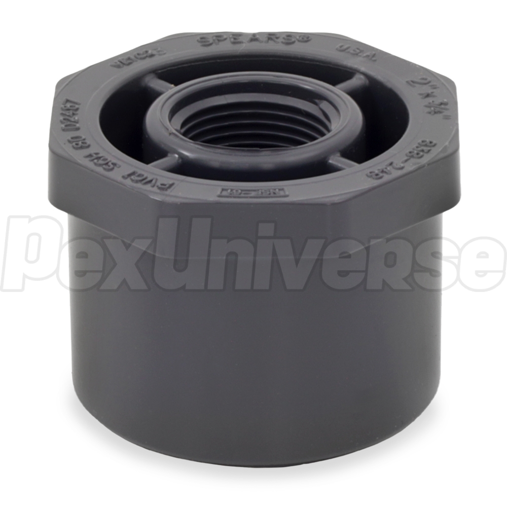 This Schedule 80 PVC reducer bushing adapts 3/4" male threaded pipe/fitting/valve inside a 2" PVC fitting or outlet. Spigot x FIP (female NPT threaded) connections.