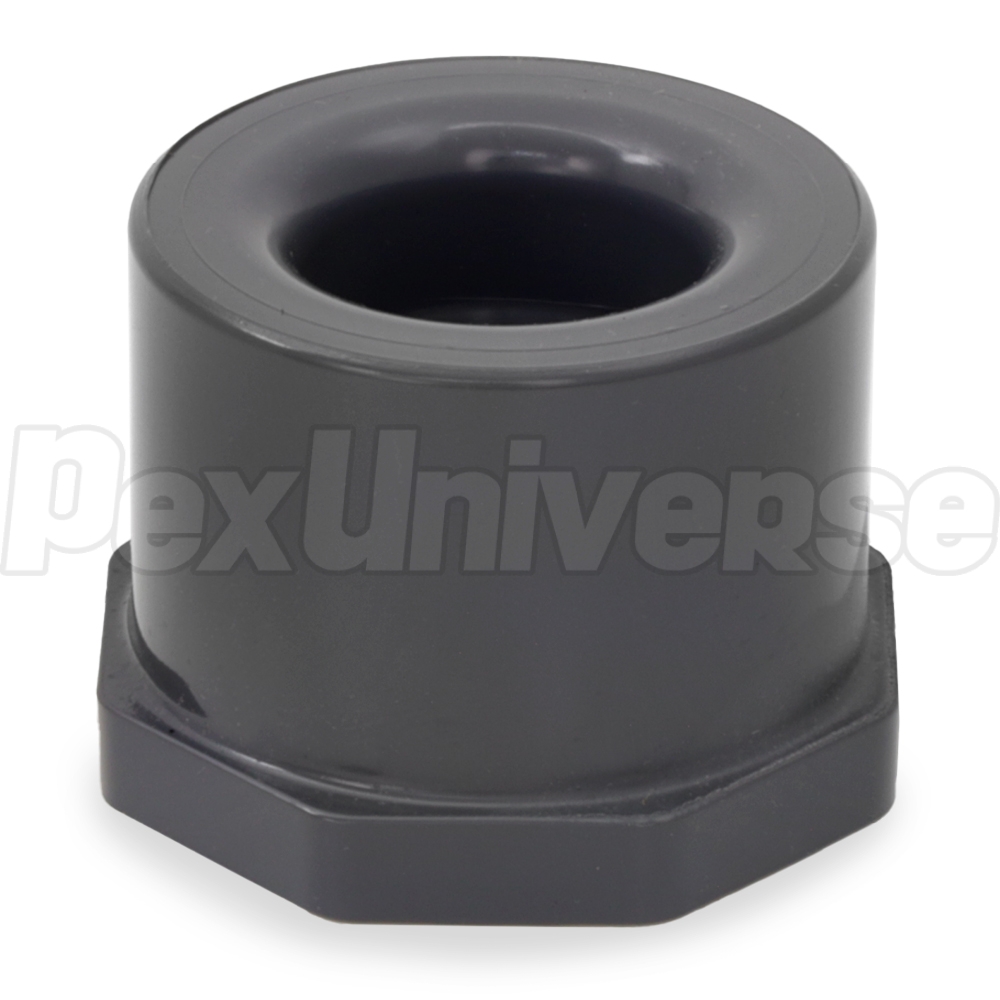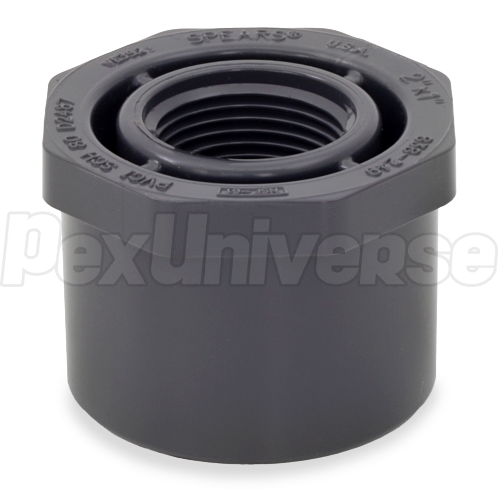 This Schedule 80 PVC reducer bushing adapts 1" male threaded pipe/fitting/valve inside a 2" PVC fitting or outlet. Spigot x FIP (female NPT threaded) connections.
