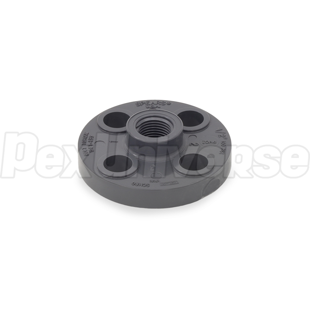 Class 150, Schedule 80 PVC solid (one-piece) flange with 1/2" FIP (female NPT threaded) connection - for use with standard flanged valves, fittings, etc. Compatible with GK1 (Buna-N/NBR), GK2 (EPDM) and GK3 (Viton/FKM) series flange gaskets.
