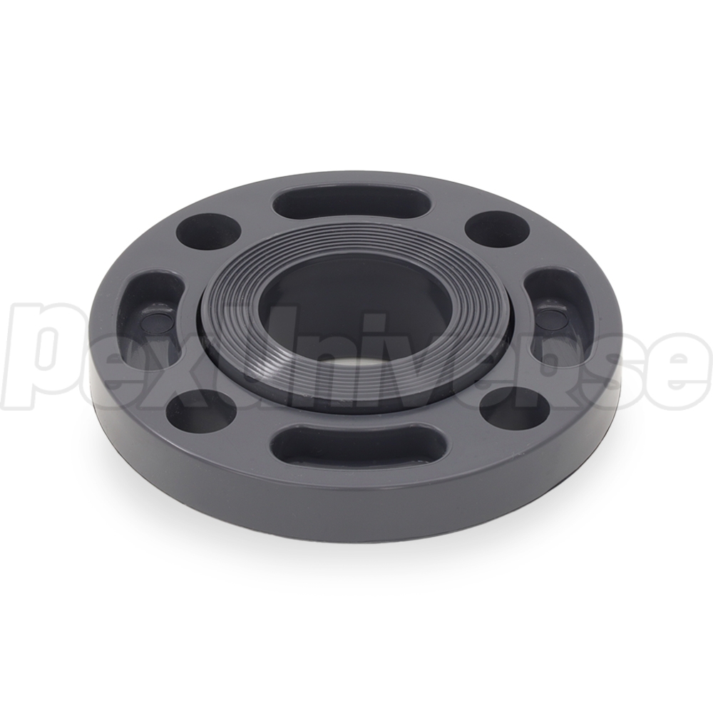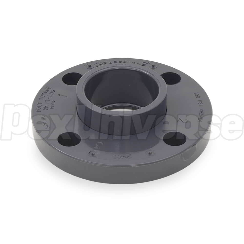 Class 150, Schedule 80 PVC Van Stone (swivel) flange with 2" Socket connection (for 2" Sch 80 PVC pipe) - for use with standard flanged valves, fittings, etc. Compatible with GK1 (Buna-N/NBR), GK2 (EPDM) and GK3 (Viton/FKM) series flange gaskets.