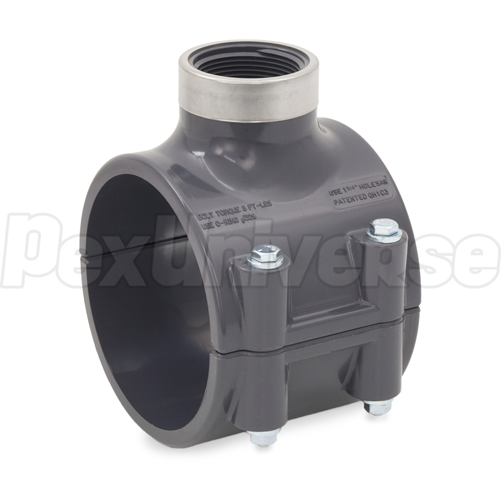 4" PVC Pipe x 1-1/2" FIP Threaded SR (Special Reinforced) Clamp-On Saddle Tee, Sch 80