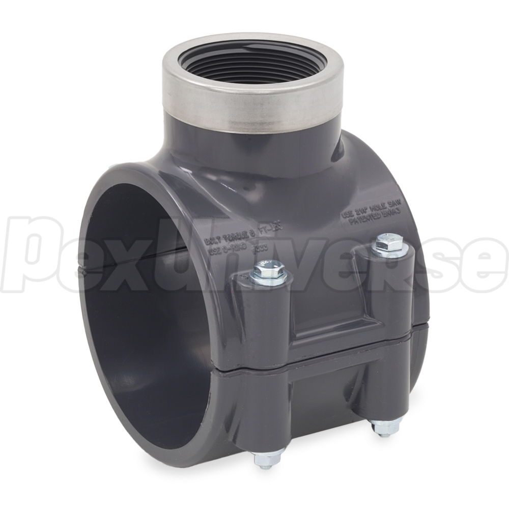 This Schedule 80 PVC pipe saddle (saddle tee) fits over a 4" Sch 80 PVC pipe and provides a 2" FIP (female NPT threaded), Special-Reinforced (with st. steel band) outlet for connection of a side line, fitting, valve, gauge, etc. This saddle is clamp-on type, with EPDM O-ring sealing gasket and does not require PVC cement (glue). It comes with complete set of zinc-plated bolts and nuts.