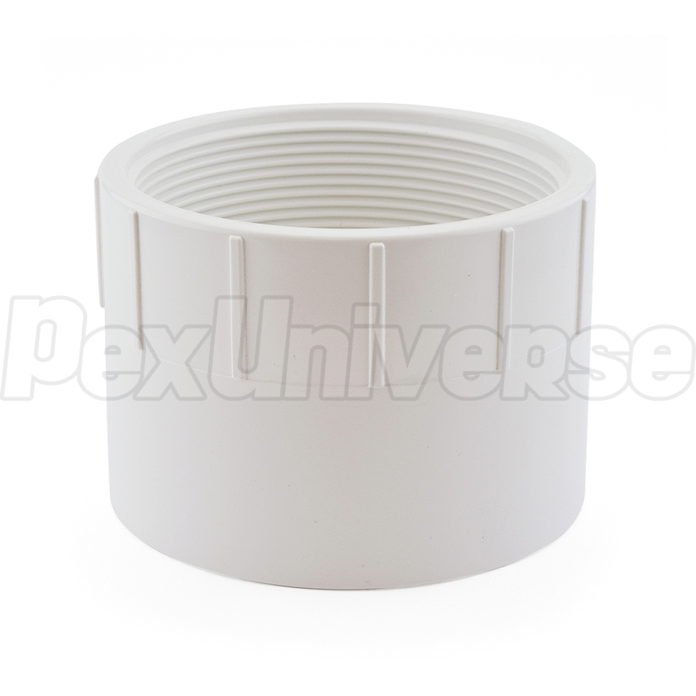 This adapter fitting connects 3" PVC pipe to a 3" male threaded outlet (standard NPT thread) in a straight line.