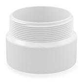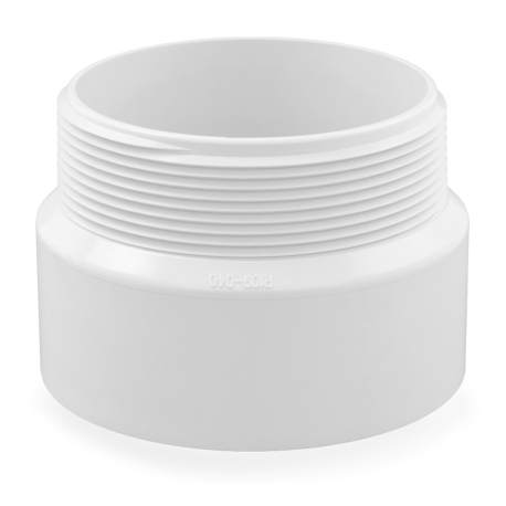 This adapter fitting connects 4" PVC pipe to a 4" female threaded outlet (standard NPT thread) in a straight line.
