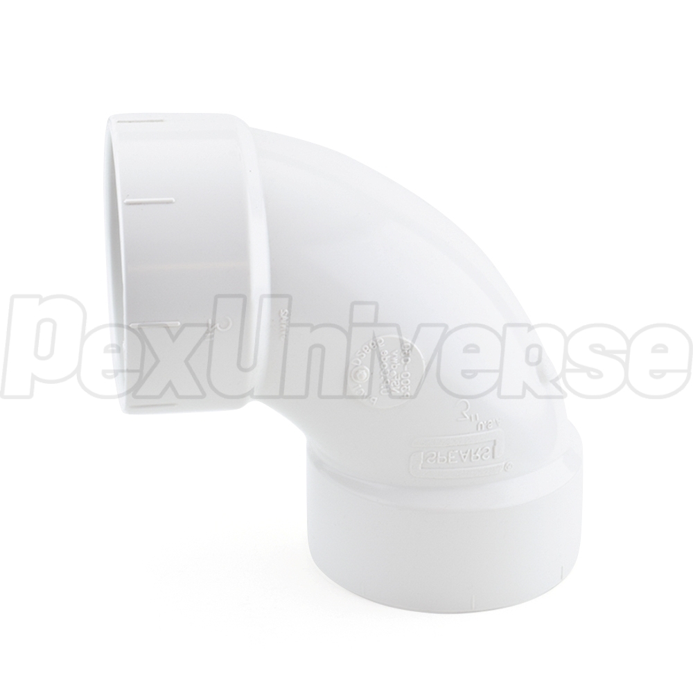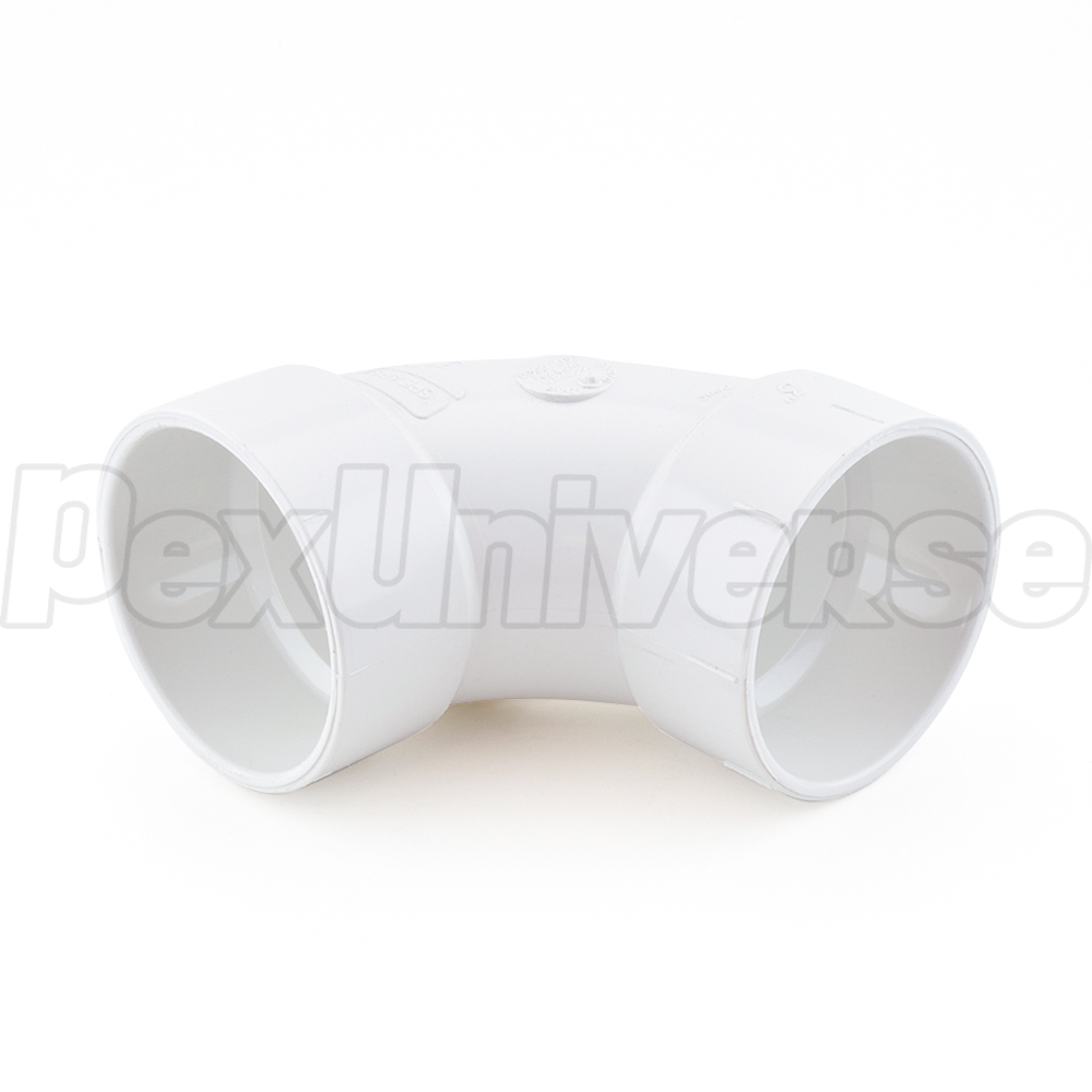 This elbow fitting connects two 3" PVC pipes together at a 90-degree angle.