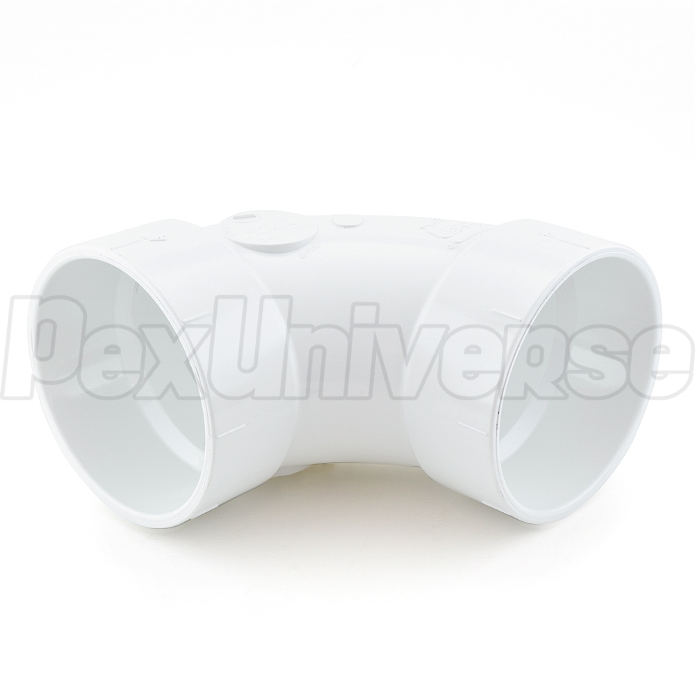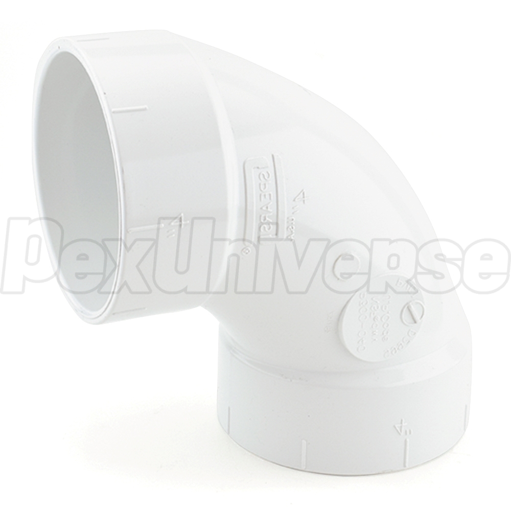 This elbow fitting connects two 4" PVC pipes together at a 90-degree angle.