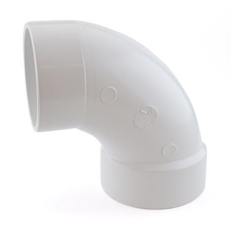 This elbow fitting connects 4" PVC pipe to 4" PVC DWV fitting at a 90-degree angle.