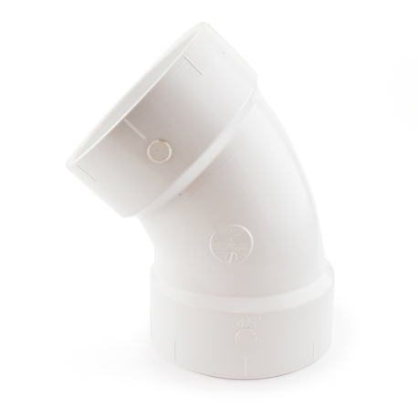This elbow fitting connects two 4" PVC pipes at a 45-degree angle.