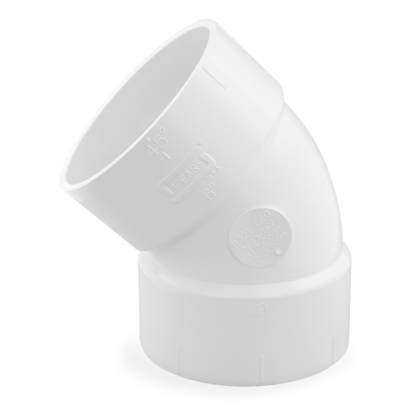 This elbow fitting connects two 6" PVC pipes at a 45-degree angle.