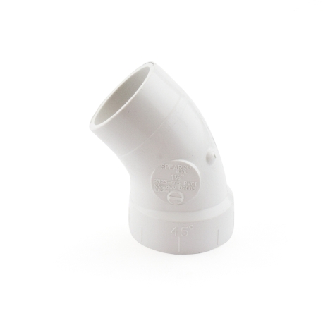 This elbow fitting connects 1-1/2" PVC pipe to 1-1/2" PVC DWV fitting at a 45-degree angle.