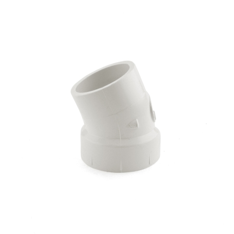 This elbow fitting connects 1-1/2" PVC pipe to 1-1/2" PVC DWV fitting at a 22.5-degree angle.