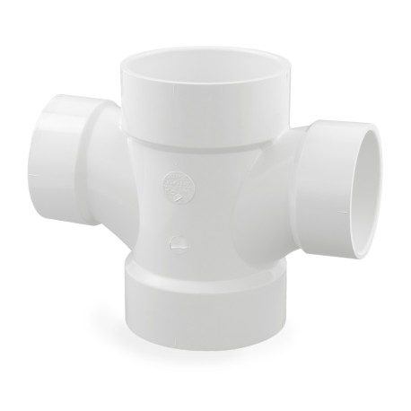 This double sanitary tee fitting connects two 3" PVC branch lines into a 4" PVC main vertical drain line. Socket (hub) connections on all outlets.