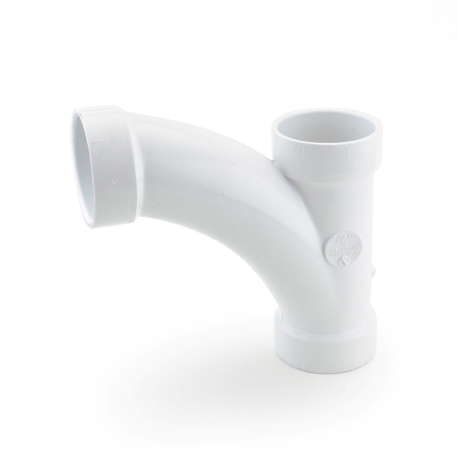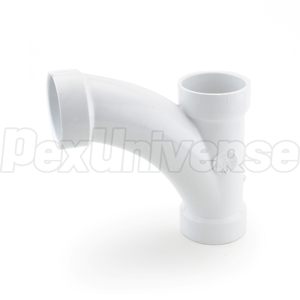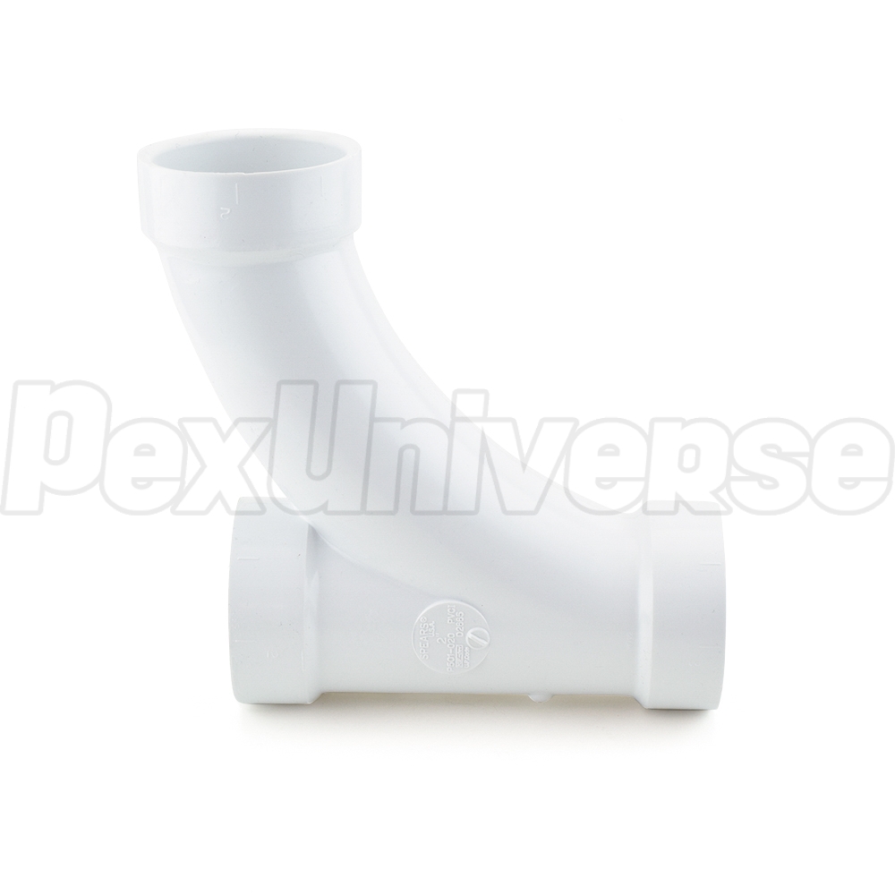 This wye & 45-elbow combo fitting (1-piece) connects a 2" PVC branch line into a 2" PVC main horizontal drain line. Socket (hub) connections on all outlets.