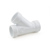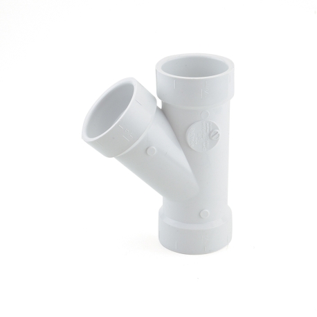 This wye fitting connects a 1-1/2" PVC branch line into a 1-1/2" PVC main horizontal drain line. Socket (hub) connections on all outlets.