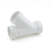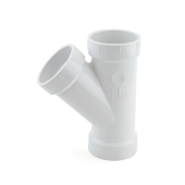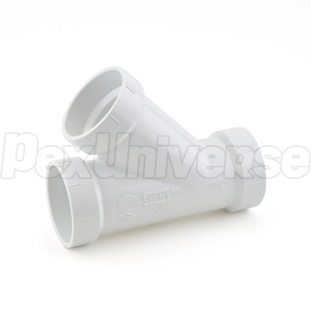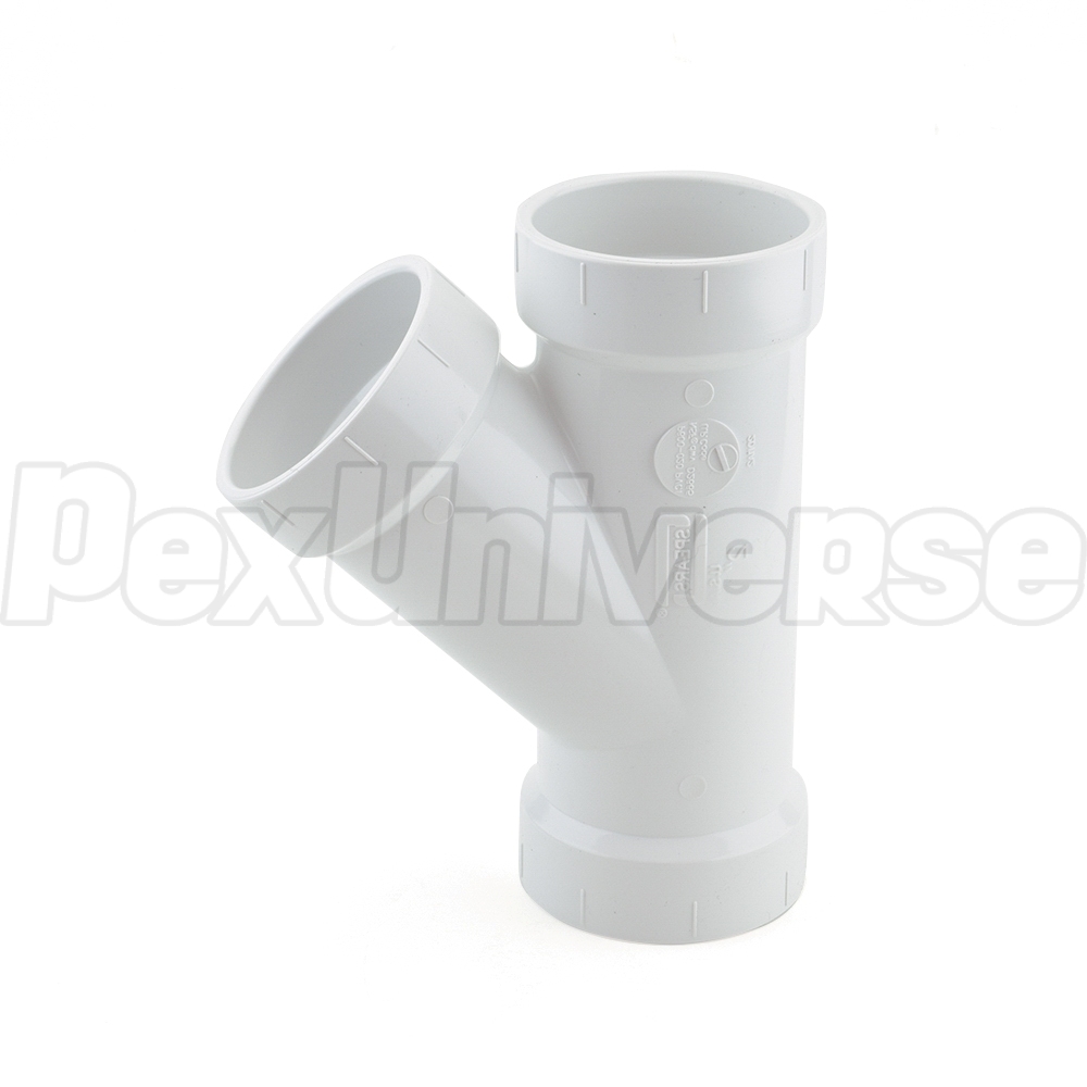 This wye fitting connects a 2" PVC branch line into a 2" PVC main horizontal drain line. Socket (hub) connections on all outlets.