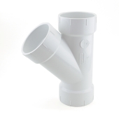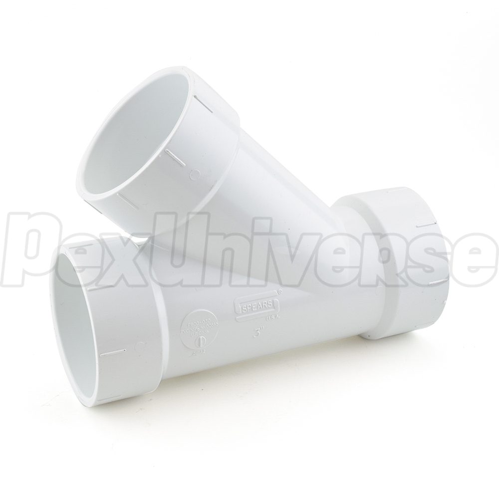 This wye fitting connects a 3" PVC branch line into a 3" PVC main horizontal drain line. Socket (hub) connections on all outlets.