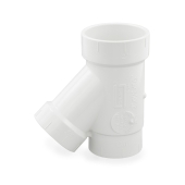 This reducing PVC wye fitting has 2" bottom x 1-1/2" top x 1-1/2" side outlets. Hub (socket) connections.