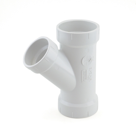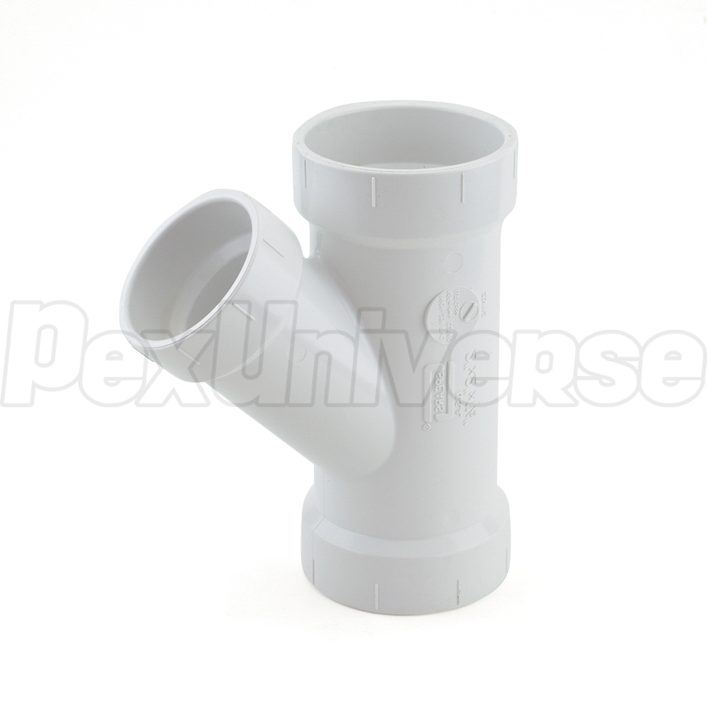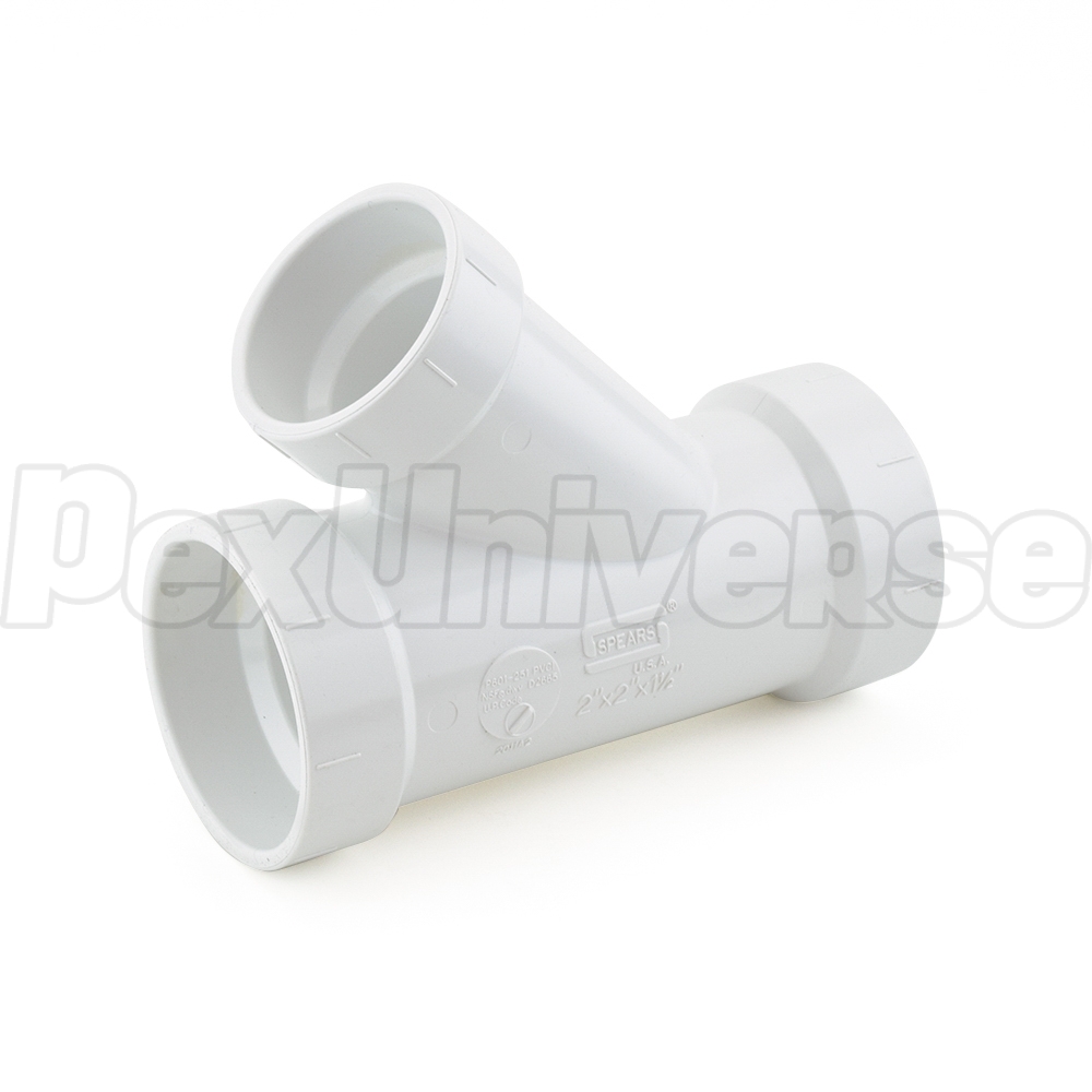 This wye fitting connects a 1-1/2" PVC branch line into a 2" PVC main horizontal drain line. Socket (hub) connections on all outlets.