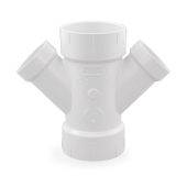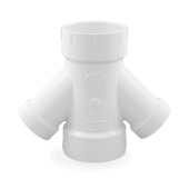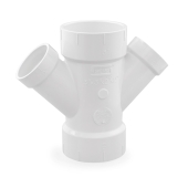 Reducing double wye PVC fitting with 3" bottom x 3" top x 2" side x 2" side hub (socket) connections.