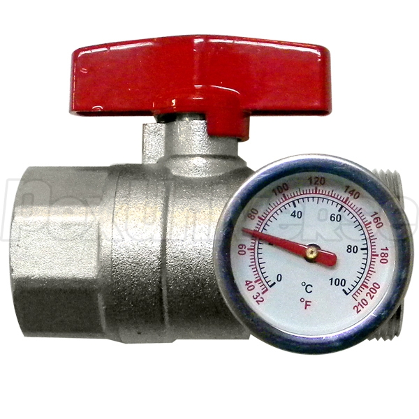 (2) 1" NPT isolation shut-off ball valves with 1/4-turn color coded handles and built-in replaceable thermometers (both F/C readings displayed).