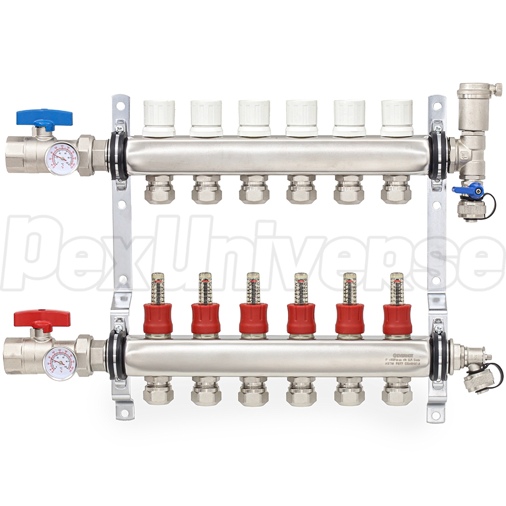 6-branch, Premium Radiant Heat Manifold Set with 1/2" PEX adapters (Supply and Return pair).