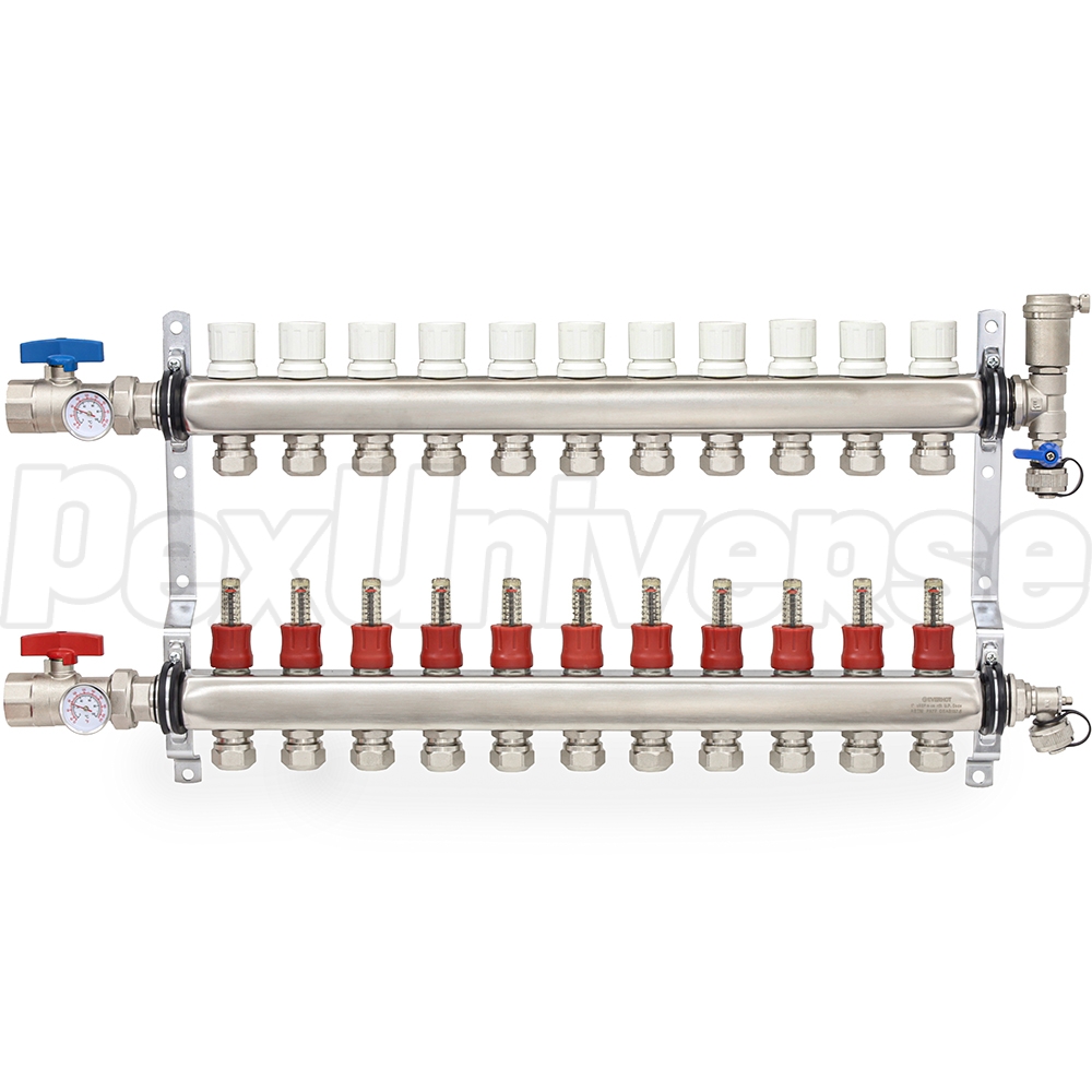 11-branch, Premium Radiant Heat Manifold Set with 1/2" PEX adapters (Supply and Return pair).