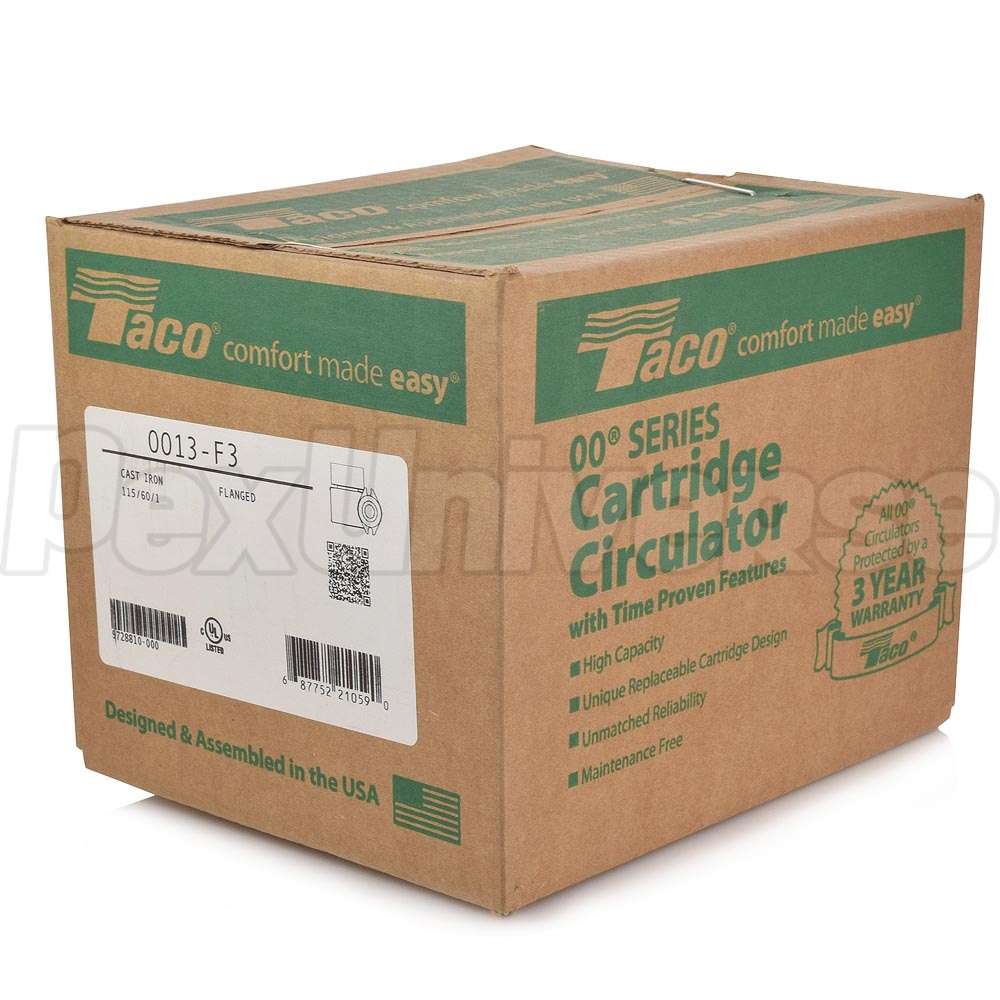 Taco 0013-F3 Circulator Pump is designed for use in high head and high flow applications in larger residential and light commercial systems. The Taco 0013-F3 circulator is perfect for boilers with high pressure drop, fan coil units, heat exchangers, large radiant heat systems and geothermal systems. Universal flange to flange dimensions and flange orientation allow allows the Taco 0013-F3 circulator to replace many other models. This model is compact, features low power consumption and ideal for high-efficiency jobs.