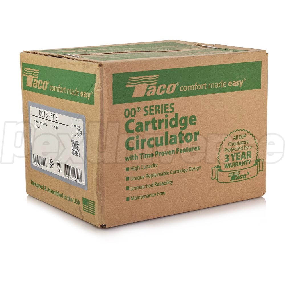 A built-in replaceable cartridge of the 0013 series circulators contains all of the moving parts, allowing to replace the cartridge instead of replacing the entire circulator. Low power consumption and compact design make the Taco 0013-SF3 model ideal for high-efficiency jobs.