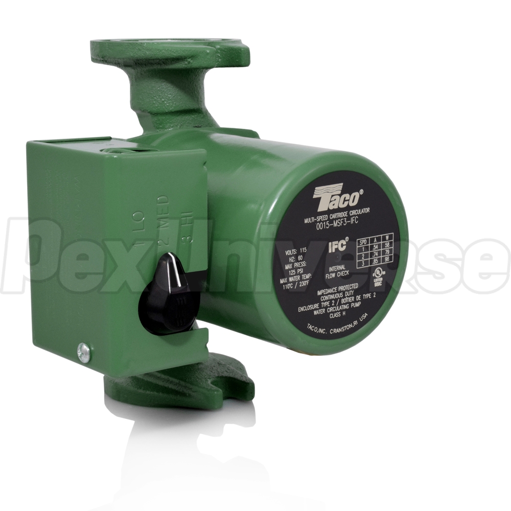3-Speed switching capability of the 0015-MSF3-IFC Taco Circulator Pump provides a convenient way to match a wide combination of PEX / Copper tube diameters and length of runs. Taco 00R has the highest starting torque in its class and a removable, high-flow Integral Flow Check (IFC) that reduces pressure drop and prevents gravity flow.