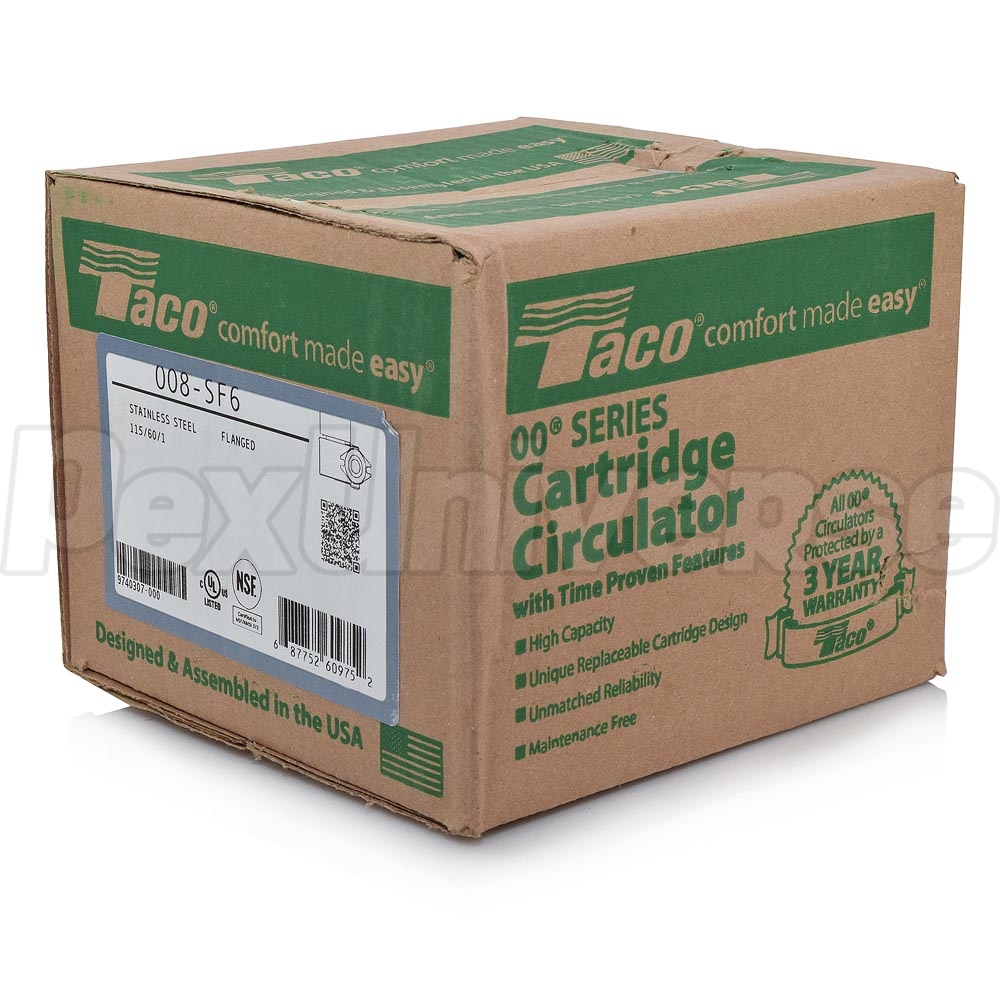 Features a unique replaceable cartridge which allows easy field-servicing, instead of replacing the entire circulator. Taco 008-SF6 circulator pump is compact, direct-drive model, with low power consumption and high-efficiency.