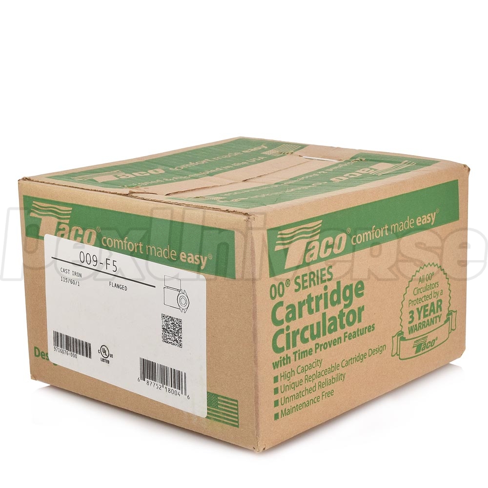 The High Velocity series Taco 009-F5 Circulator Pump is designed for use in high head and low flow applications in hydronic heating and radiant heating. Features a field-serviceable cartridge which allows to replace the cartrigde without replacing the entire circulator. The Taco 009-F5 maintenance free design provides unmatched reliability.
