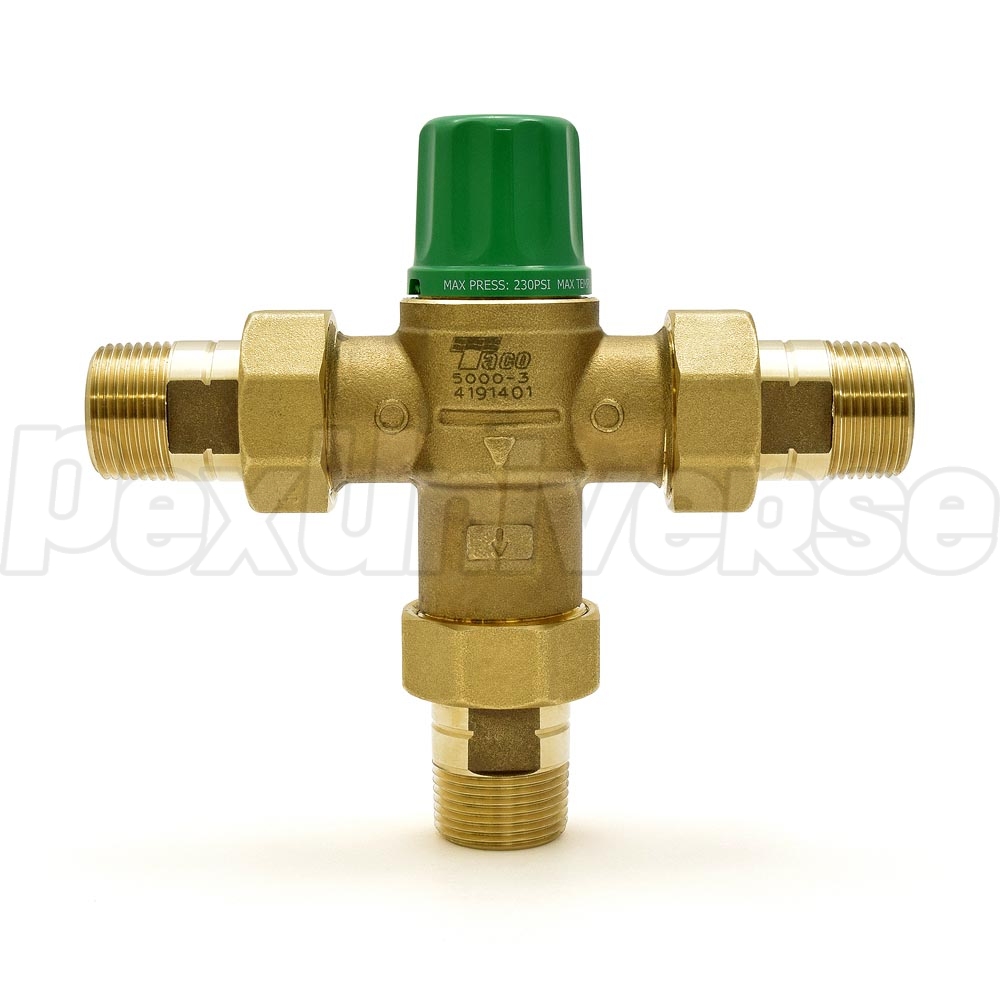 Taco 5003-T3 Mixing Valve is a dual-purpose mixing or diverting valve that delivers fail-safe security and superior performance. The ASSE 1017-approved valve provides shut-off reliability on either a hot or cold water supply failure. Its high flow and low headloss make the Taco 5003-T3 mixing valve ideal for applications such as domestic hot water, radiant heat applications, installations with large variations in flow rate and supply conditions, and installations that require precise control of water temperature. Mixing valve's unique design ensures a stable and controlled mixed water temperature throughout the extended 85-176°F range.