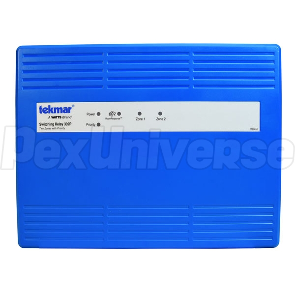 Tekmar 302P 2-Zone Switching Relay connects two low-voltage (24V) thermostats and operates (2) circulating pumps, providing heating to zoned hydronic (baseboard/radiators) or radiant floor heat system. There is an optional priority of Zone 1 over the Zone 2. Zone 1 can also be used to provide heat to an indirect hot water tank. Compatible with all thermostat and circulator brands.