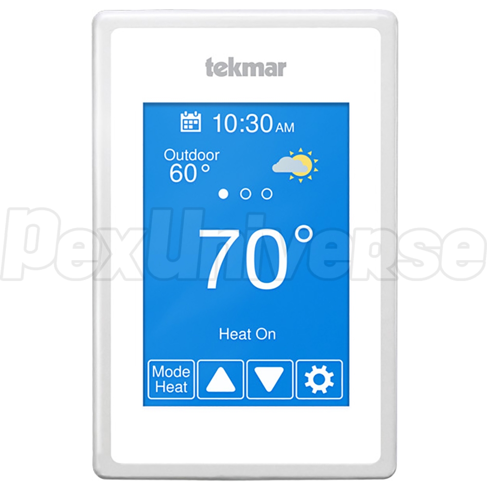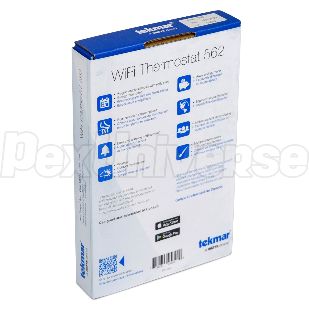 Tekmar 562 is a WiFi-enabled touchscreen programmable thermostat designed to operate a two stage heating, one stage cooling system and a fan. 562 model can be operated via the Internet using Watts Home mobile app. A 7-day, 4-event programmable schedule is available and the early start feature automatically learns to heat up the room by the scheduled time. An Away mode is quickly and easily accessed to provide energy savings when the space is unoccupied. The thermostat supports radiant floor heating and optional floor sensor (079, not included) can be installed to enhance comfort and improve system response.