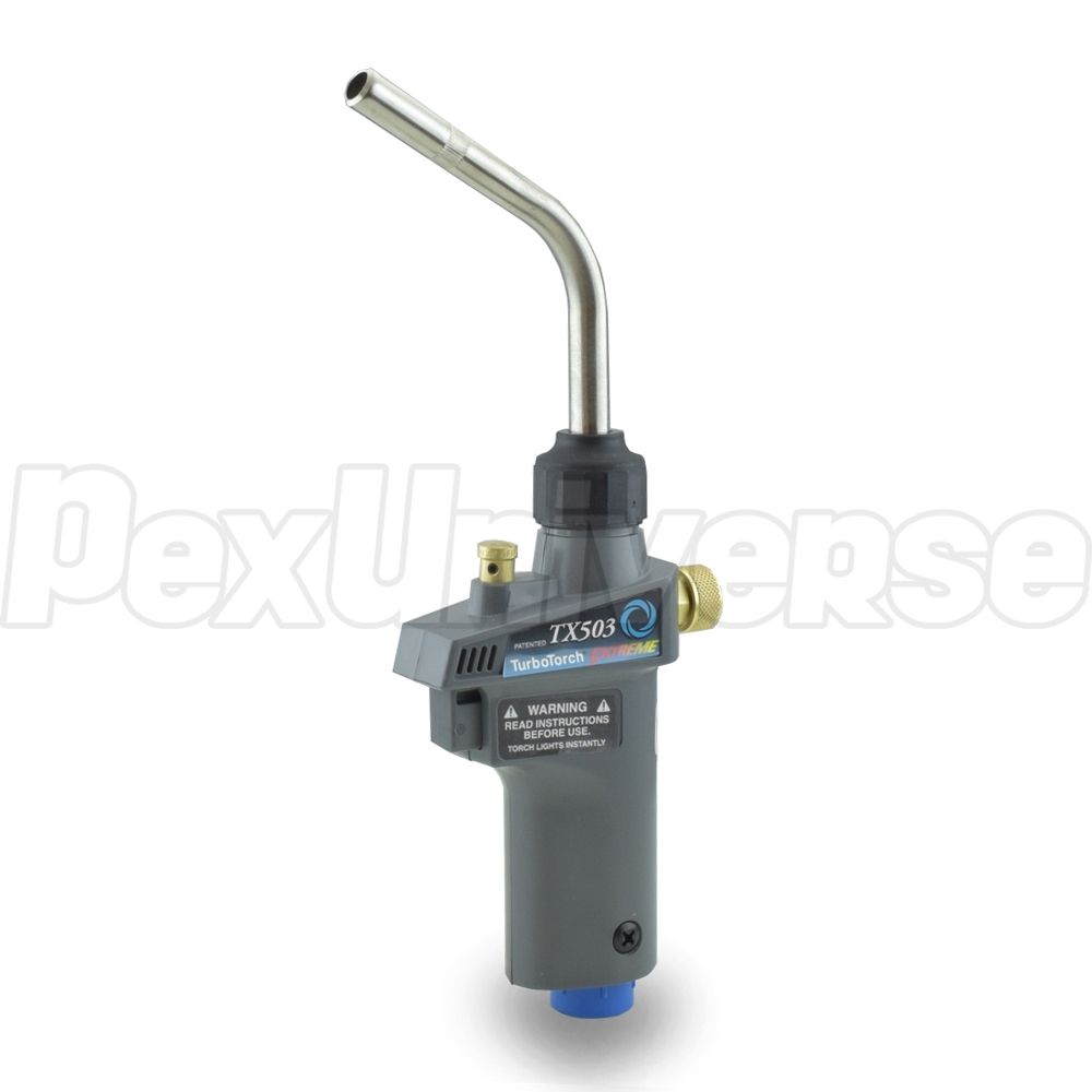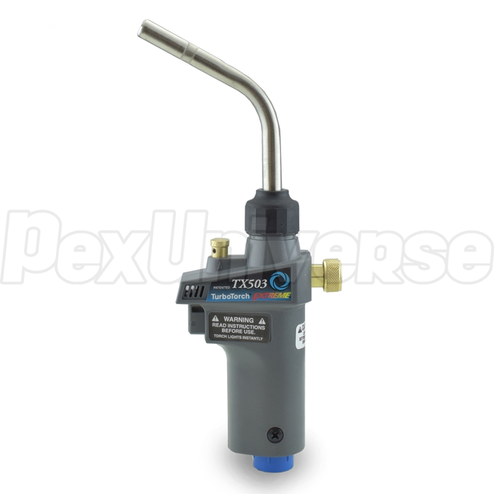 TX-503 self-lighting torch is a convenient, durable and universal model for use in everyday general plumbing applications. It is compatible with standard 14.1 oz MAP-Pro or propane tanks and comes with handy features such as flame-hold button and gas flame output adjustment knob. A higher-output analog of this torch is TX-504 model. Both are also available as a kit in TX-500 model.
