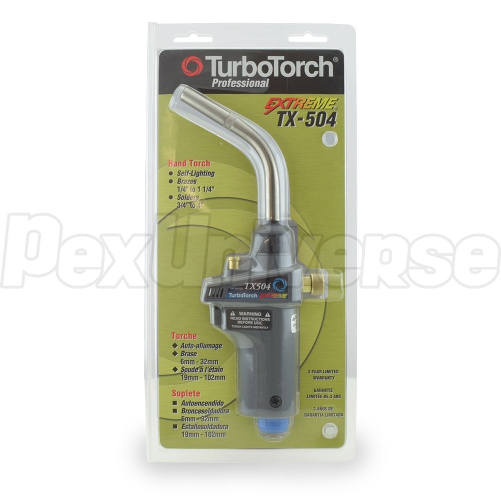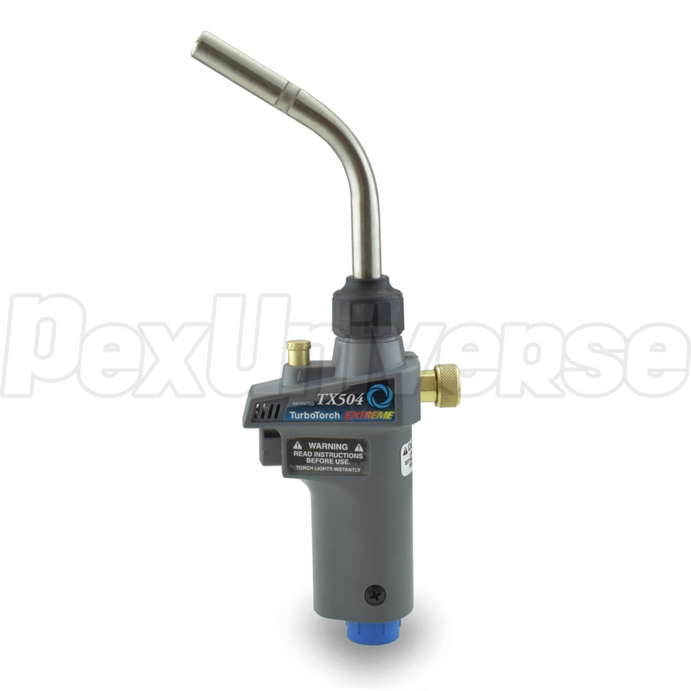 TX-504 self-lighting torch is a convenient, durable and universal model for use in higher-demand plumbing and HVAC applications. It is compatible with standard 14.1 oz MAP-Pro or propane tanks and comes with handy features such as flame-hold button and gas flame output adjustment knob. A lower-output analog of this torch is TX-503 model. Both are also available as a kit in TX-500 model.
